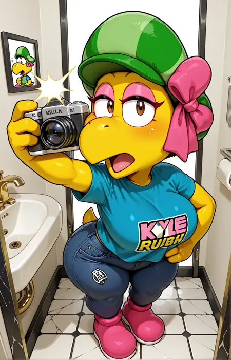 Kylie Koopa, mario \(series\), 1girl, Koopa Troopa, yellow skin, anthro turtle, scaly, reptile girl, turtle shell, pink shell, koopa shell, shell, beak, pink eyeshadow, pink shoes, pink footwear, shoes, green hat, pink bow, hat bow, bow on hat, striped headwear, camera, holding camera,