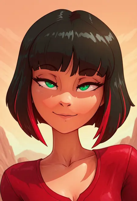 EmberXL, 绿色眼睛, 黑发带红色挑染, 短发, 针对式短发,
