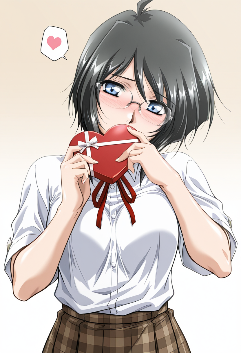 옷: 흰 셔츠, 빨간 리본, 체크 스커트, 갈색 스커트