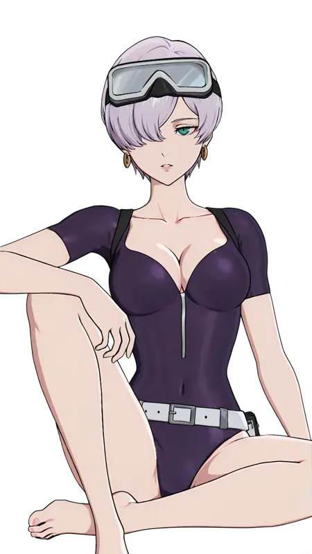 아웃핏 3 mono7ds, 1girl, solo, 티알 아이스, 블루 아이스, 은-라벤더 헤어, 단발, 앞머리, 한쪽 눈 위의 머리카락, 귀걸이, 고리 귀걸이, 벌어진 입술, 슬림 핏, 큰 가슴, 둥근 가슴, 날씬하고 곡선 있는 몸매, 둥근 엉덩이, 안경, 머리 위에 안경, outfit5, 가슴 노출, 목뼈 노출, 짧은 소매, 맨발, 벨트, 레오타드, 그라데이션, 다리 노출, 배꼽 커버, 보라색 레오타드,