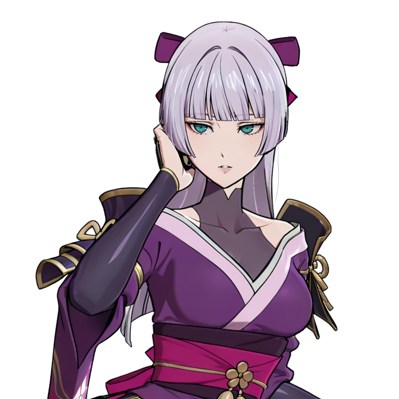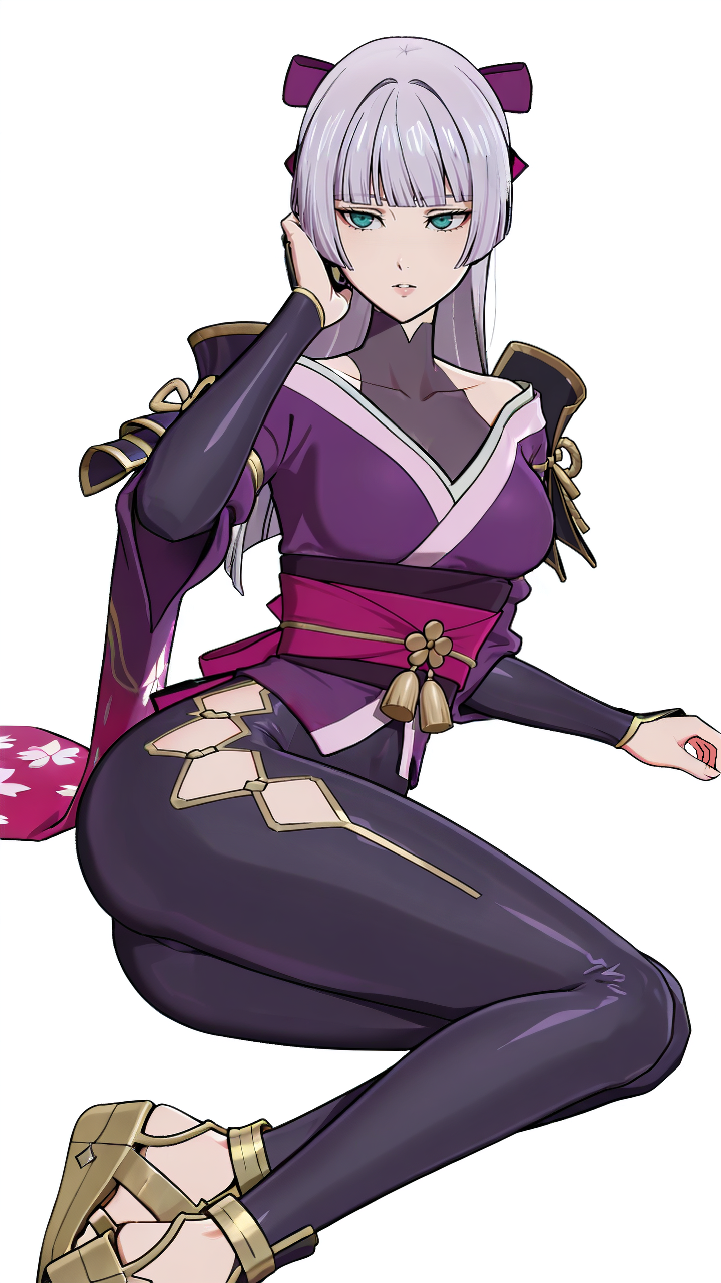 아웃핏 8 mono7ds, 1girl, solo, 티알 아이스, 블루 아이스, 은-라벤더 헤어, 긴 머리, 앞머리, 둔한 앞머리, 긴 곧은 머리, 히메 컷, 머리 리본, 머리 장식, 벌어진 입술, 슬림 핏, 큰 가슴, 둥근 가슴, 날씬하고 곡선 있는 몸매, 둥근 엉덩이, outfit9, 리본, 목뼈, 머리 리본, 일본 복장, 기모노, 띠, 꽃잎, 바디수트, 발가락, 오비, 샌들, 어깨 갑옷, 보라색 리본,