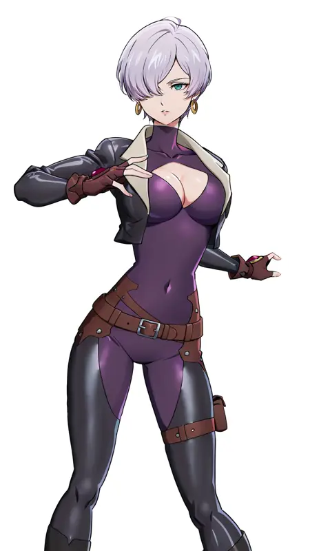 아웃핏 1 mono7ds, 1girl, solo, 티알 아이스, 블루 아이스, 은-라벤더 헤어, 단발, 앞머리, 한쪽 눈 위의 머리카락, 귀걸이, 고리 귀걸이, 벌어진 입술, 슬림 핏, 큰 가슴, 둥근 가슴, 날씬하고 곡선 있는 몸매, 둥근 엉덩이, outfit1, 검정 재킷, 짧은 재킷, 가죽 재킷, 열린 재킷, 긴 소매 재킷, 장갑, 보라색 바디수트, 젖힌 가슴 부분, 목뼈 커버, 가슴 노출, 배꼽 커버, 손가락 없는 장갑, 갈색 벨트, 십자 벨트, 검정 바지, (왼쪽 허벅지 스트랩), 파우치, 허벅지 파우치, 검정 신발, 무릎 부츠, 검정 부츠,