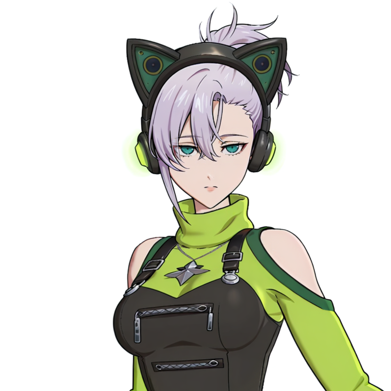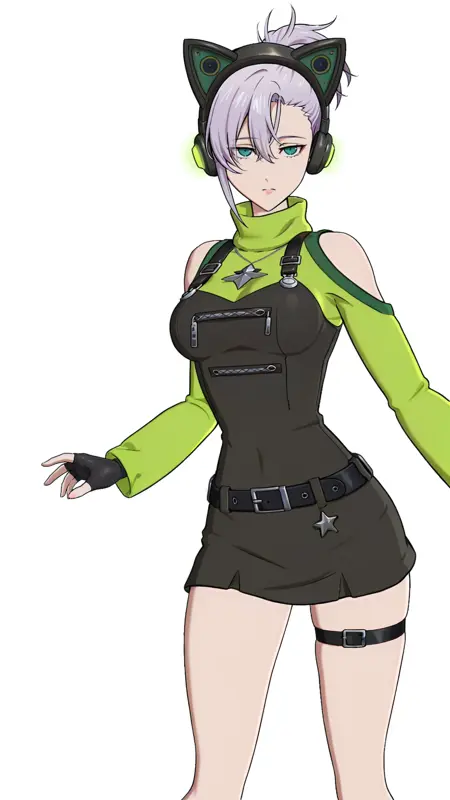 아웃핏 7 mono7ds, 1girl, solo, 티알 아이스, 블루 아이스, 은-라벤더 헤어, 단발, 앞머리, 눈 사이의 머리카락, 짧은 단발머리, 높은 단발머리, 벌어진 입술, 슬림 핏, 큰 가슴, 둥근 가슴, 날씬하고 곡선 있는 몸매, 둥근 엉덩이, outfit8, 치마, 장갑, 긴 소매, 드레스, 동물 귀, 어깨 노출, 부츠, 검정 장갑, 양말, 벨트, 고양이 귀, 손가락 없는 장갑, 검정 신발, 검정 드레스, 옷 자름, 허벅지 스트랩, 가짜 동물 귀, 터틀넥, 헤드폰, 짧은 드레스, 비대칭 머리, 비대칭 앞머리, 어깨 자름, 동물 귀 헤드폰, 고양이 귀 헤드폰, 녹색 양말,