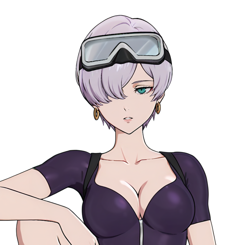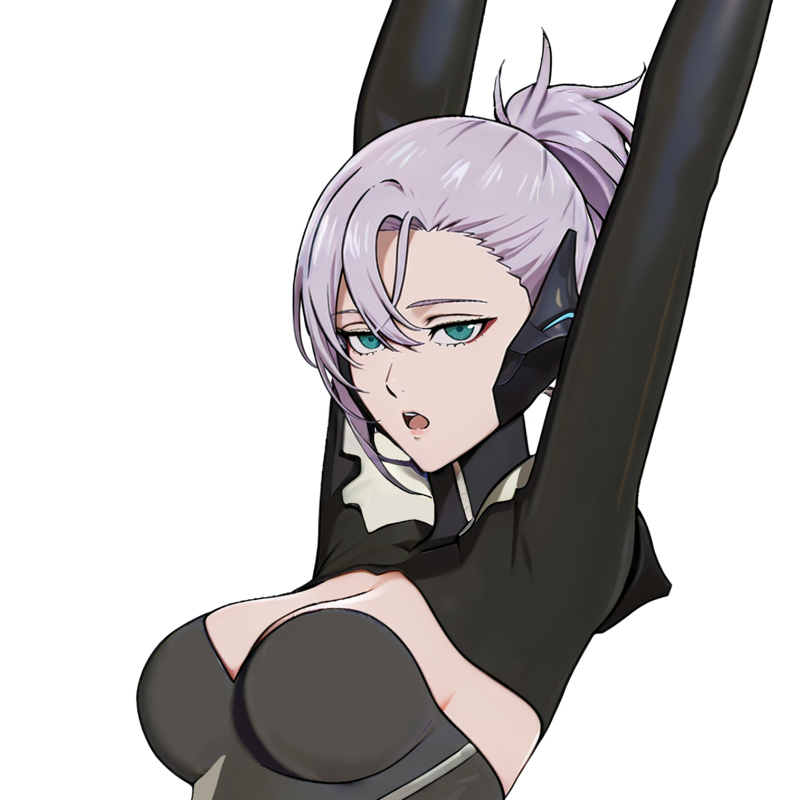 아웃핏 5 mono7ds, 1girl, solo, 블루 아이스, 티알 아이스, 은-라벤더 헤어, 단발, 앞머리, 눈 사이의 머리카락, 짧은 단발머리, 높은 단발머리, 벌어진 입술, 슬림 핏, 큰 가슴, 둥근 가슴, 날씬하고 곡선 있는 몸매, 둥근 엉덩이, outfit6, 가슴 노출, 갑옷, 옷 자름, 바디수트, 배꼽 커버, 가슴 노출, 어깨 갑옷, 과학 판타지, 검정 바디수트,
