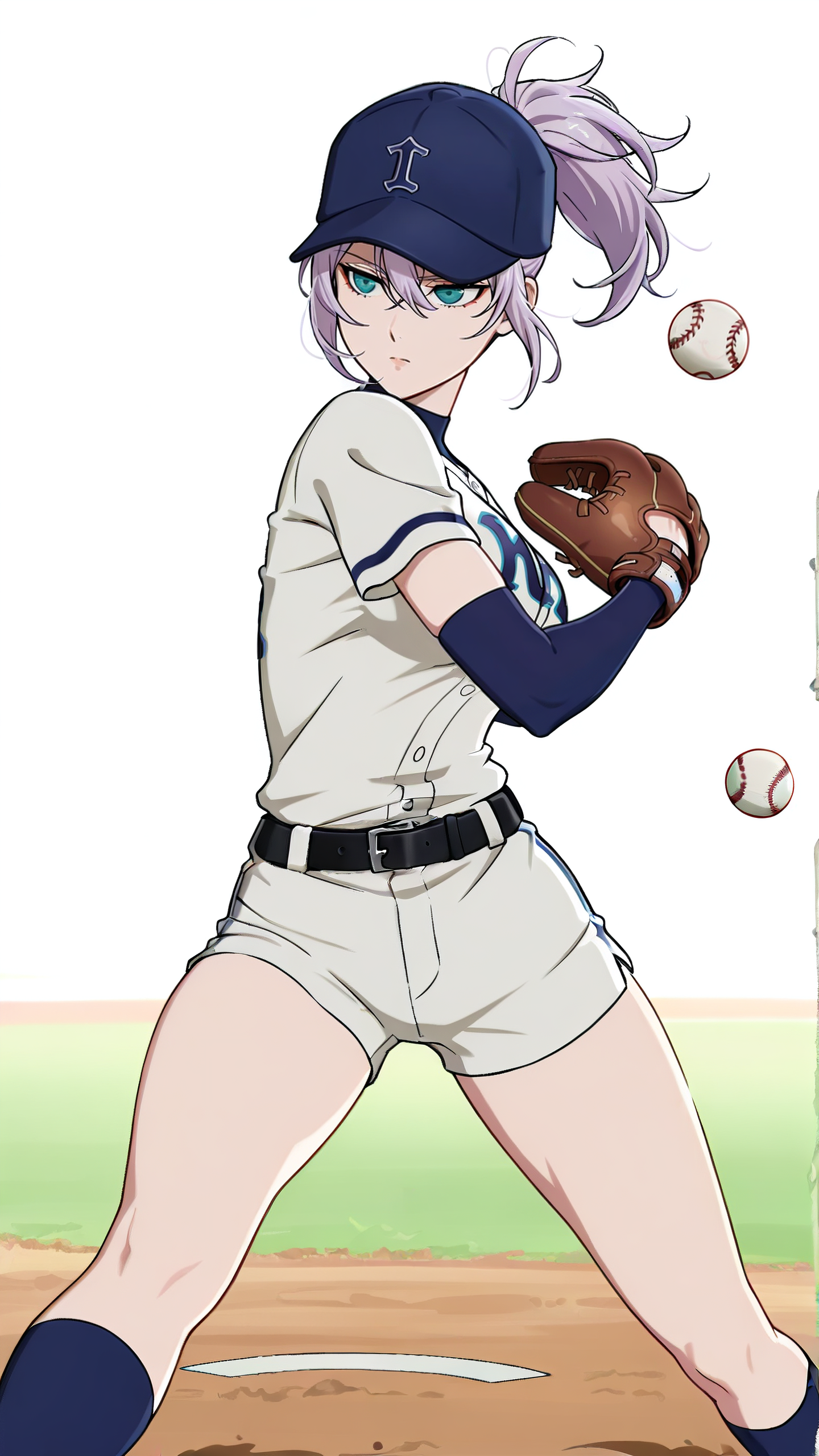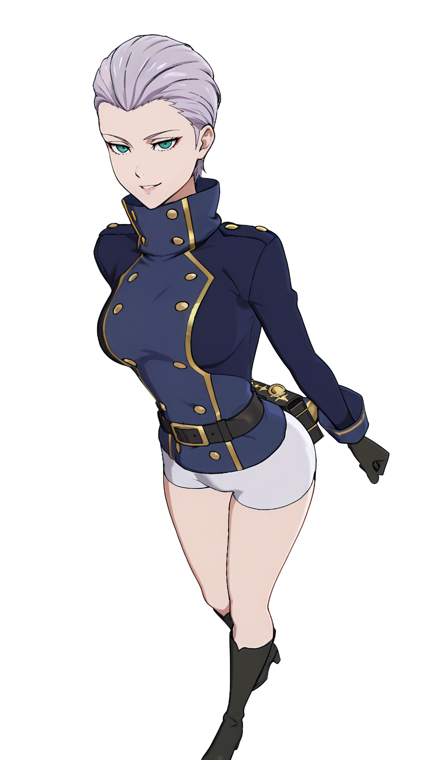 아웃핏 4 mono7ds, 1girl, solo, 티알 아이스, 블루 아이스, 은-라벤더 헤어, 단발, 벌어진 입술, 뒤로 빗어 올린 머리, 슬림 핏, 큰 가슴, 둥근 가슴, 날씬하고 곡선 있는 몸매, 둥근 엉덩이, outfit4, 장갑, 긴 소매, 재킷, 부츠, 반바지, 검정 장갑, 벨트, 검정 신발, 하이힐, 짧은 반바지, 단추, 무릎 부츠, 파란 재킷, 하이힐 부츠, 높은 칼라, 흰색 반바지, 더블 브레스트, 회색 반바지,
