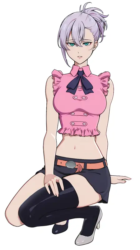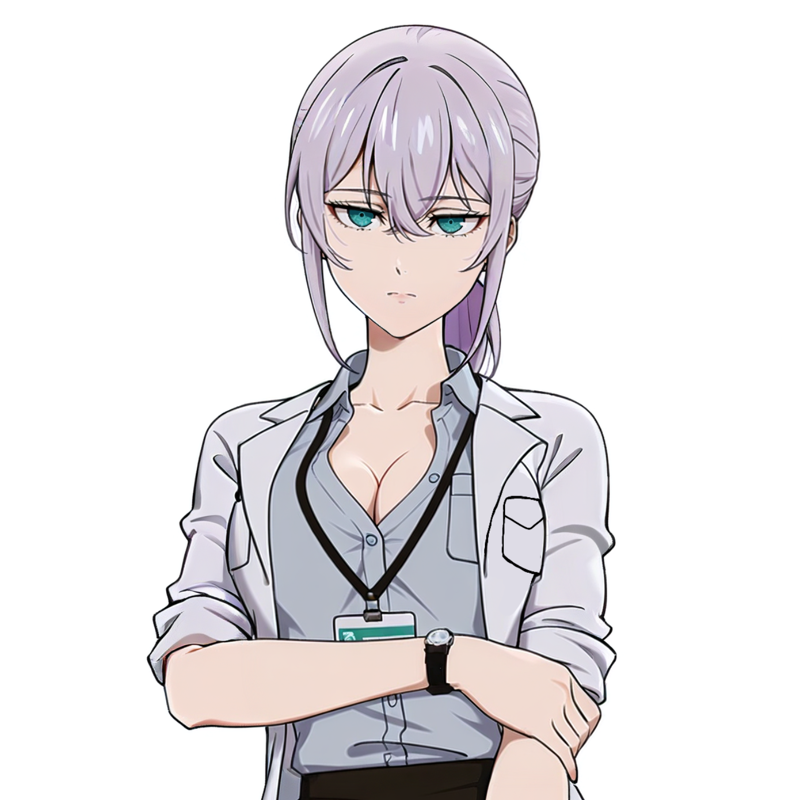 아웃핏 6 mono7ds, 1girl, solo, 티알 아이스, 블루 아이스, 은-라벤더 헤어, 긴 머리, 앞머리, 눈 사이의 머리카락, 짧은 단발머리, 높은 단발머리, 눈 사이의 머리카락, 곧은 옆머리, 어깨 길이의 옆머리, 슬림 핏, 큰 가슴, 둥근 가슴, 날씬하고 곡선 있는 몸매, 둥근 엉덩이, outfit7, 치마, 셔츠, 가슴 노출, 스타킹, 검정 치마, 검정 신발, 회색 셔츠, 소매 말아 올린 상태, 연필 치마, 시계, 갈색 스타킹, 랩코트, 아이디 카드, 란야드,