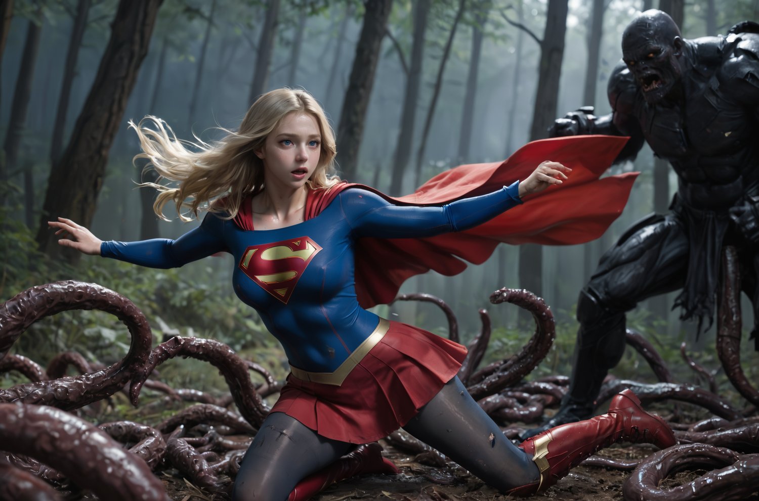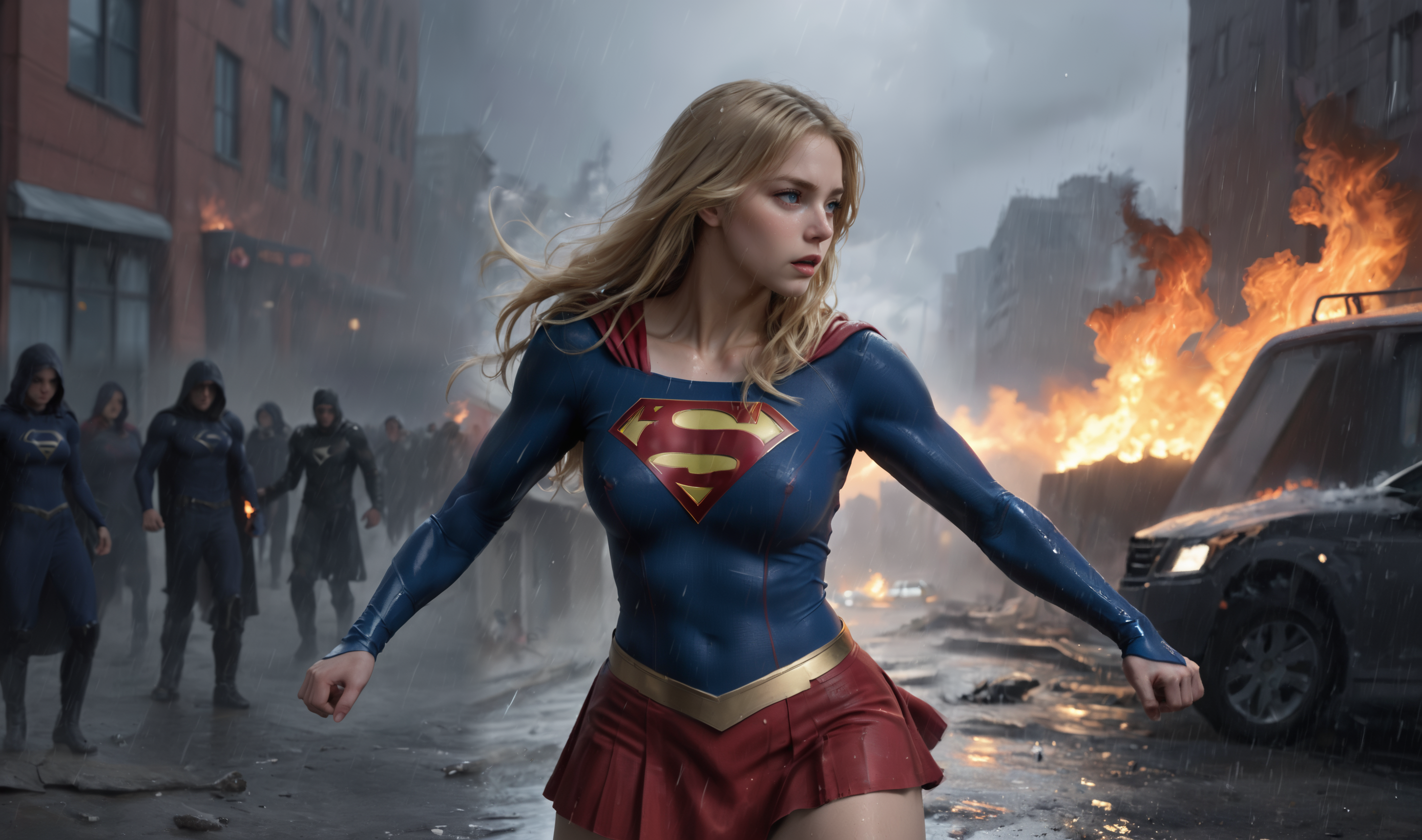 例のプロンプト:mvsupergirl, blue long sleeves, red pleated skirt, pantyhose, knee boots