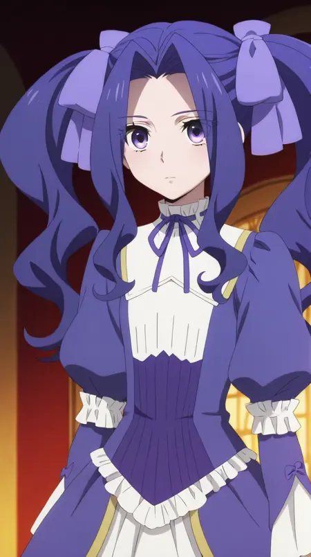 lora:meidi:0.9,melty q melromarc,meidi,1girl,twintails,purple eyes,long hair,ribbon,hair bow,dress,long sleeves,purple dress,purple hair,parted bangs,purple ribbon,hair intakes,Purple Lolita,