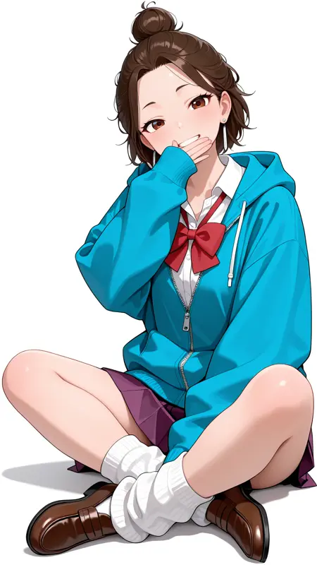 white shirt, school uniform, red bowtie, miniskirt, blue hoodie, hood down, sleeves past wrists, pleated skirt, purple skirt, unzipped, white leg warmers, brown footwear