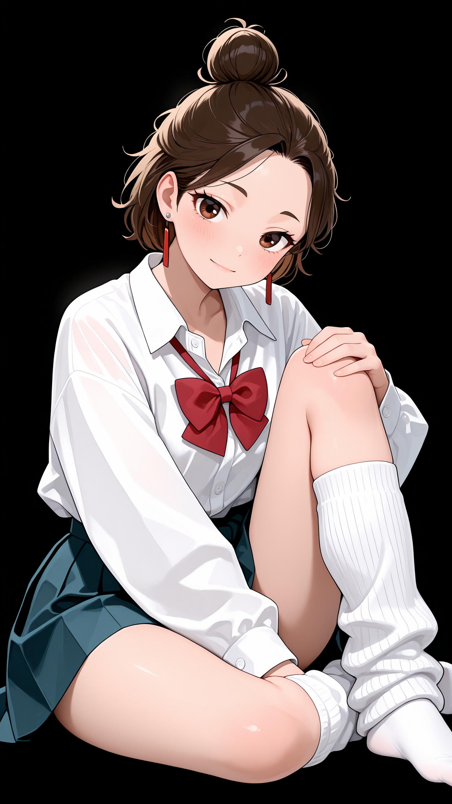 m1ko, brown hair, short hair, brown eyes, single hair bun, earrings