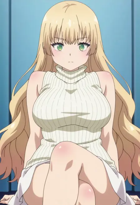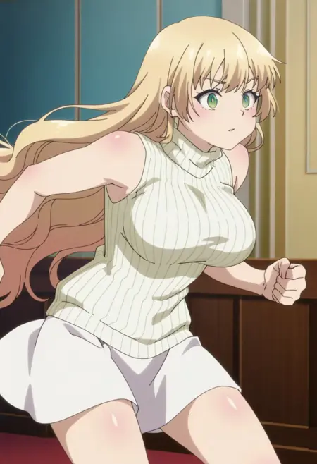 escher,long hair, blonde hair, bangs, green eyes, large breasts, anime screenshot,