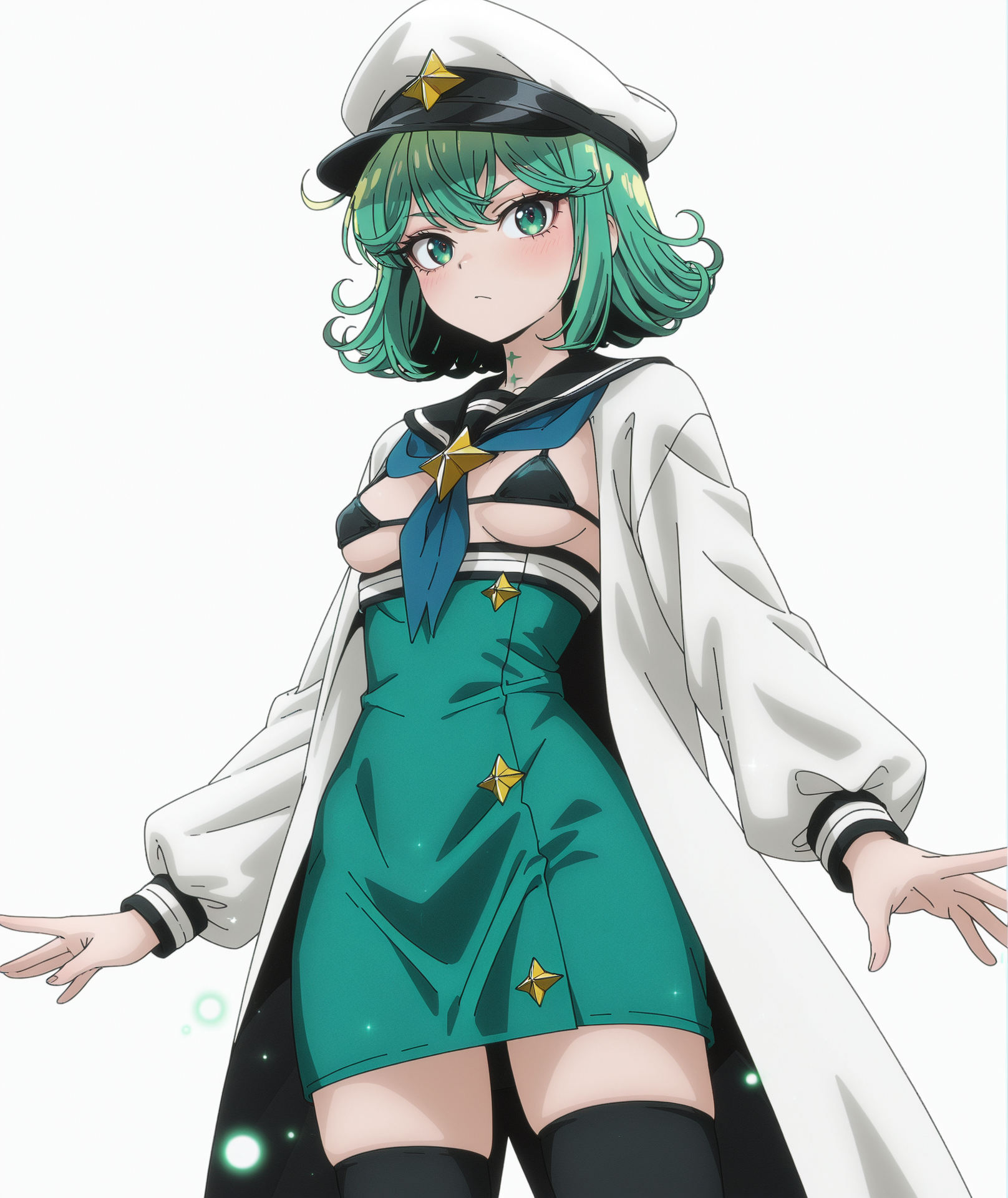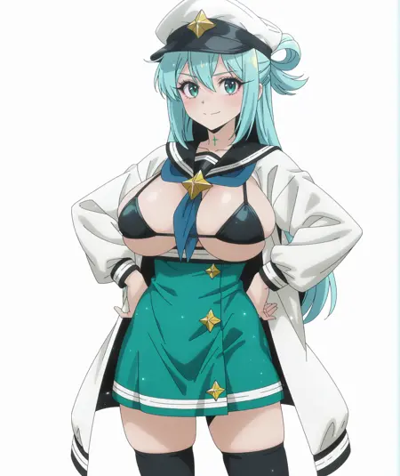 long sleeves, dress, jacket, swimsuit, bikini, open clothes, sailor collar, star (symbol), bra, neckerchief, black bikini, underboob, white jacket, black bra, micro bikini, bikini top only,