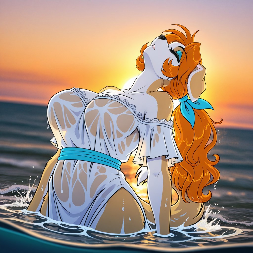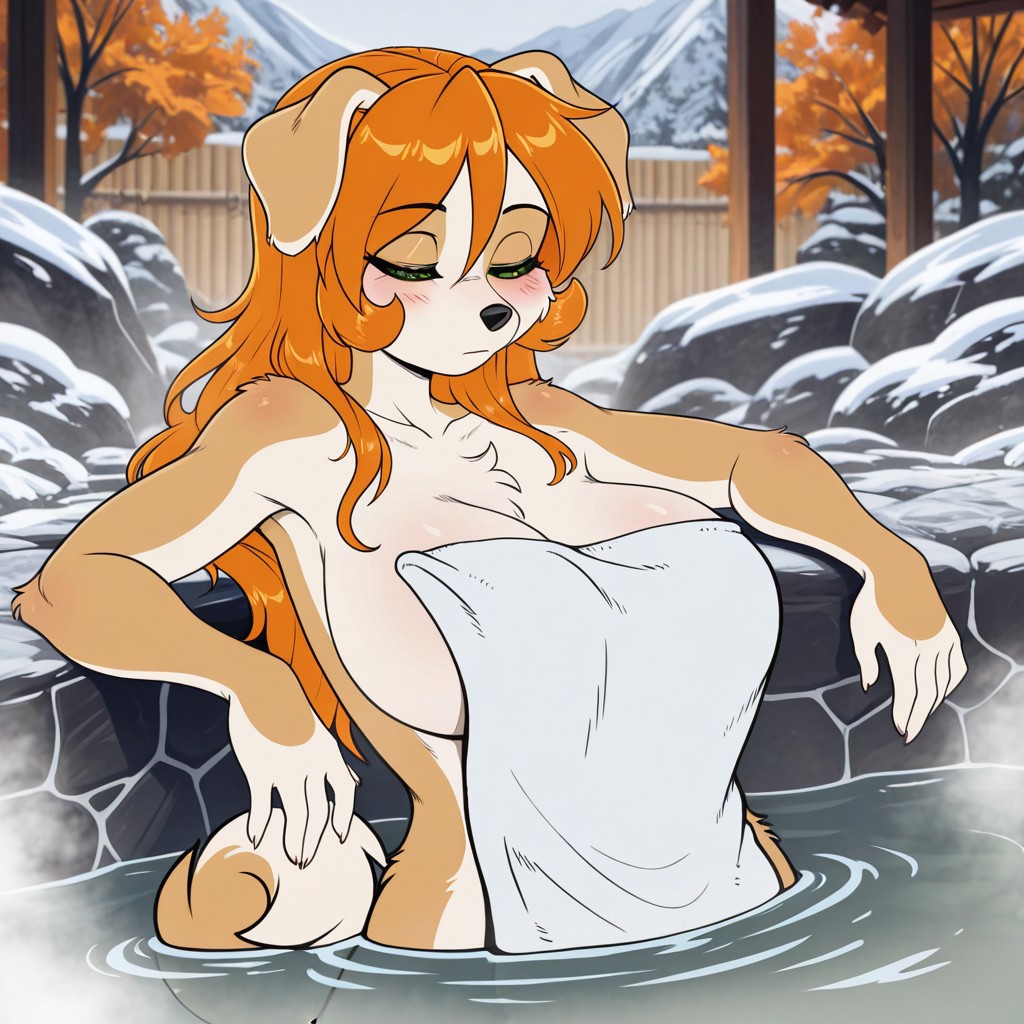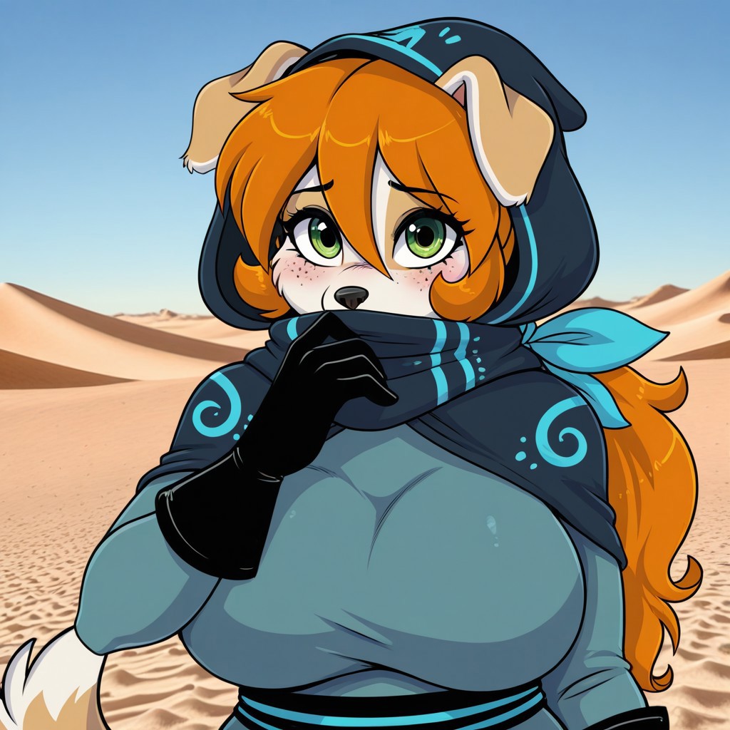 Kibbles_SD, 1girl, solo, furry, furry female, animal ears, breasts, orange hair, green eyes, dog ears, tail, long hair, snout, dog girl, large breasts, dog tail, ponytail, body fur, animal nose,