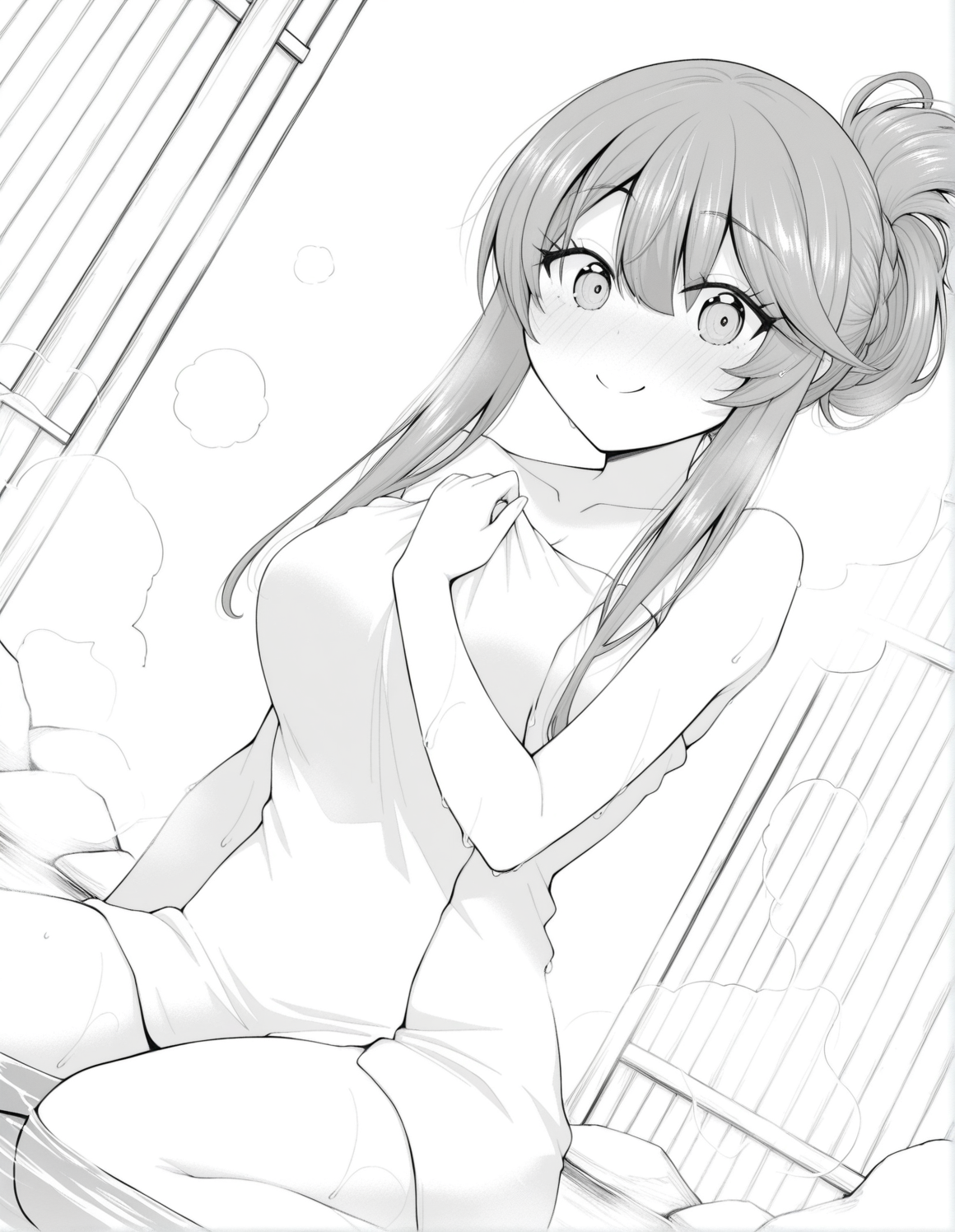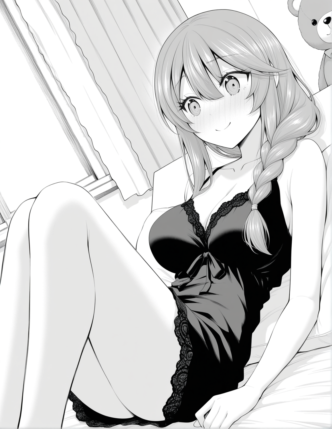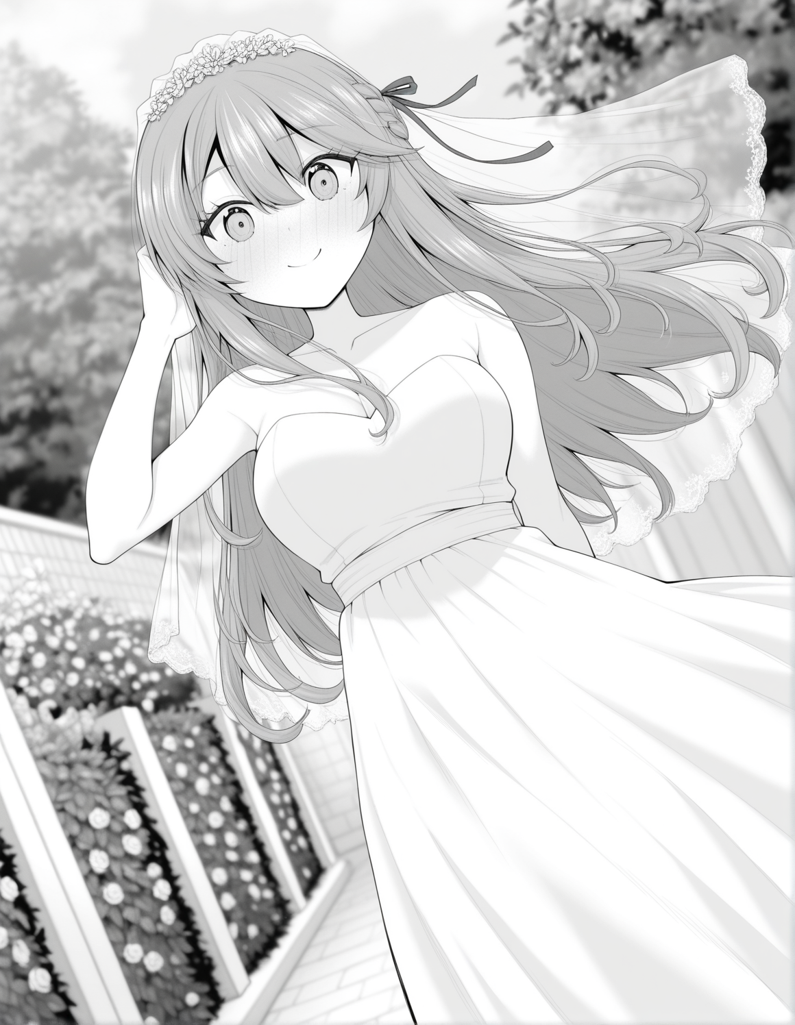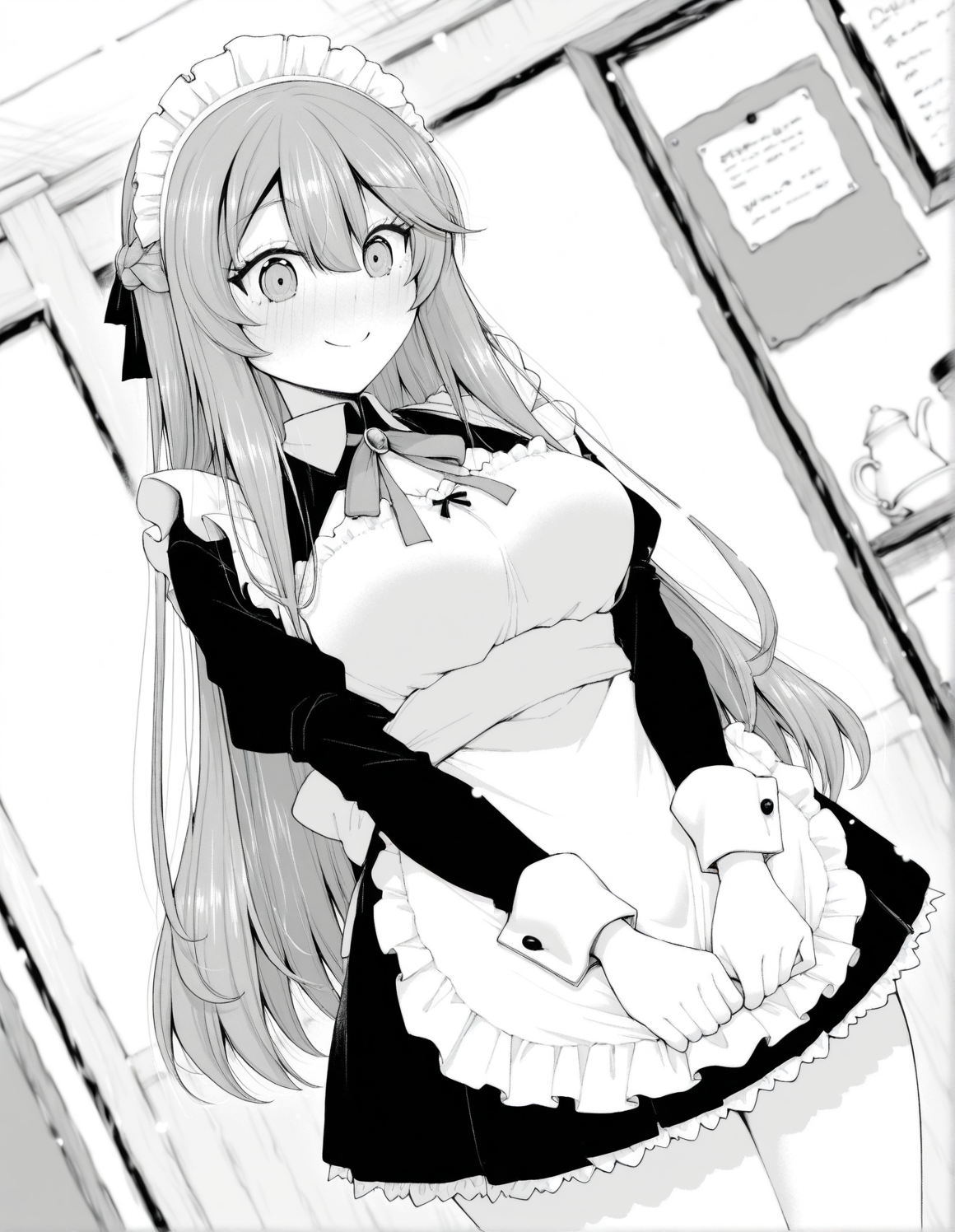 monochrome, greyscale, nanamiwah, hair between eyes, long hair, sidelocks, braid, half updo, hair ribbon