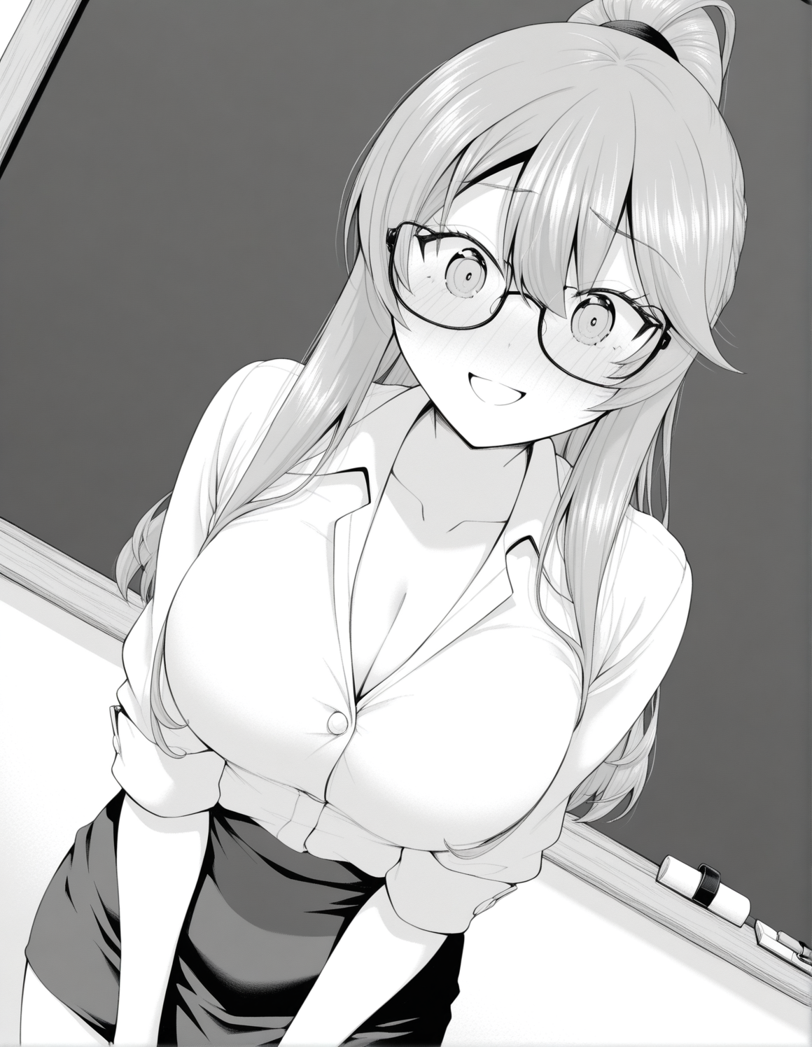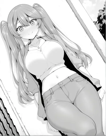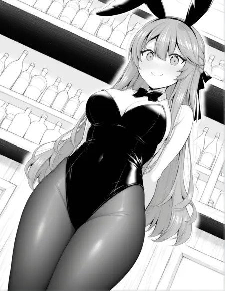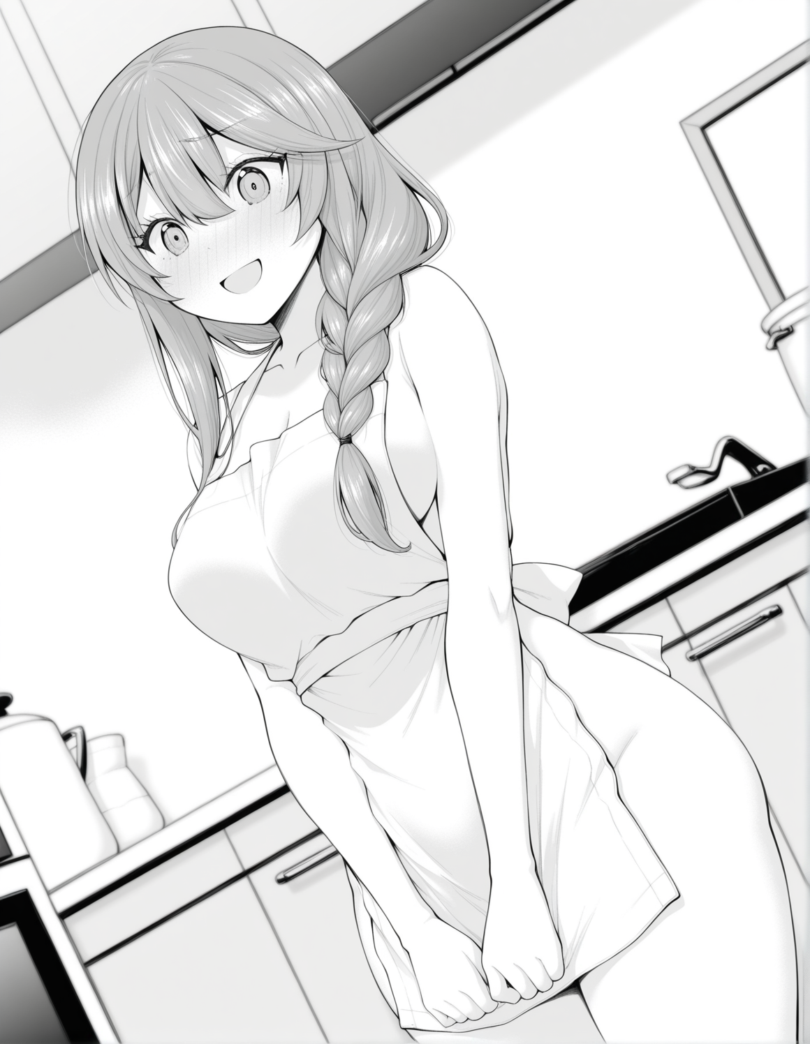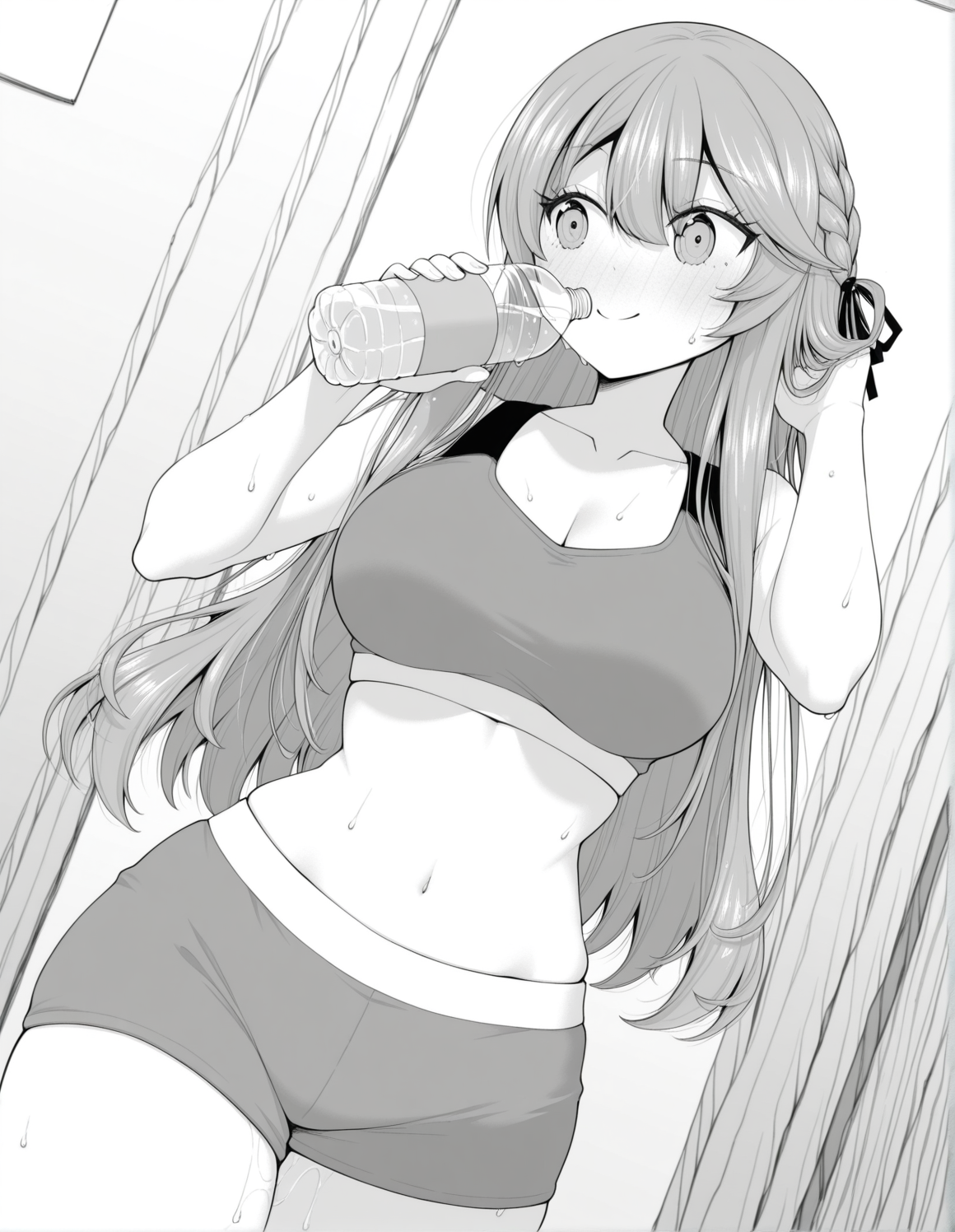 monochrome, greyscale, nanamiwah, hair between eyes, long hair, sidelocks, braid, half updo, hair ribbon