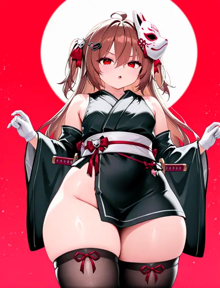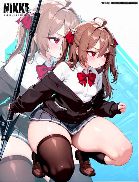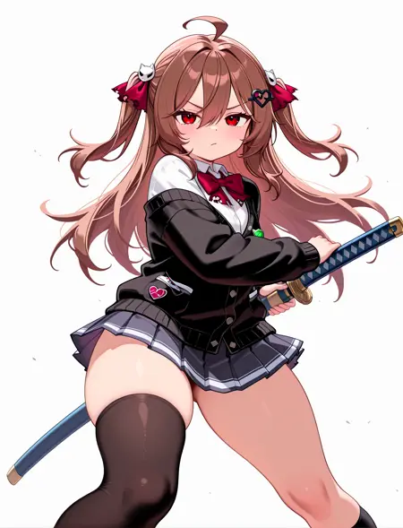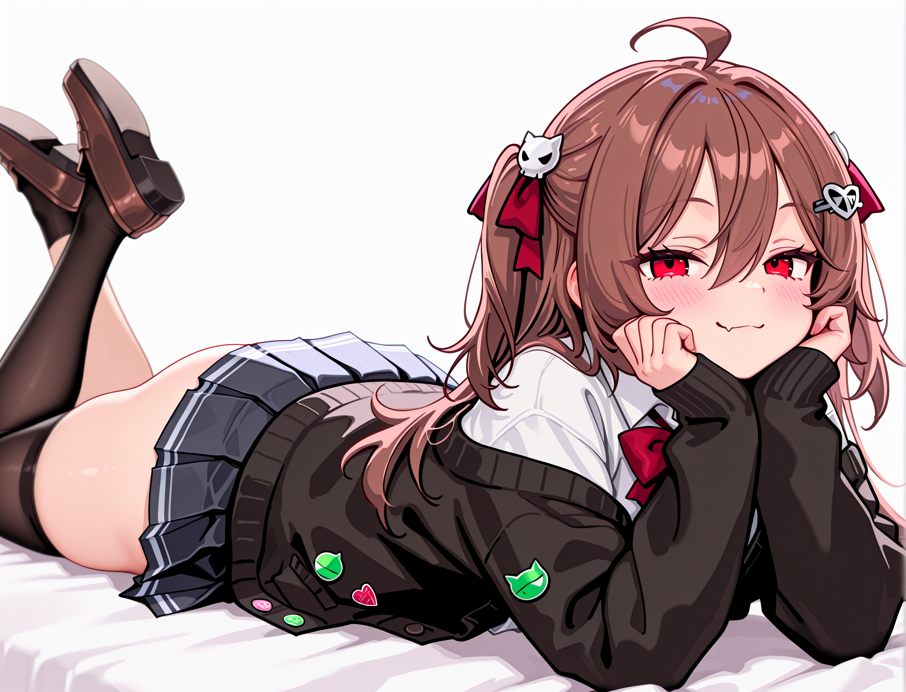 EvilV3, brown hair, long hair, two side up, red ribbons, hair between eyes, ahoge, red eyes, broken-heart hair ornament,