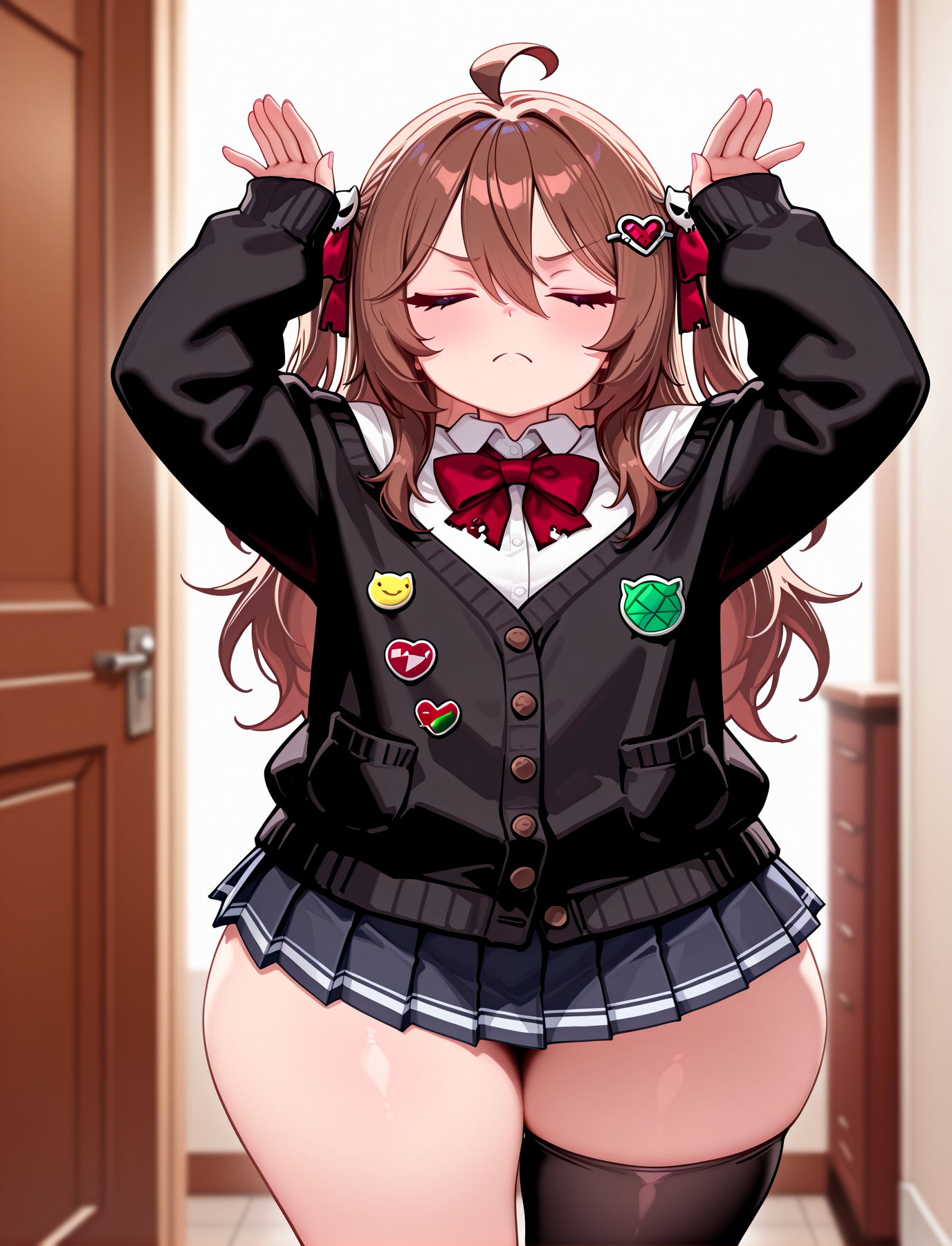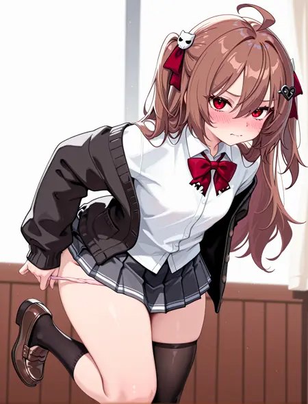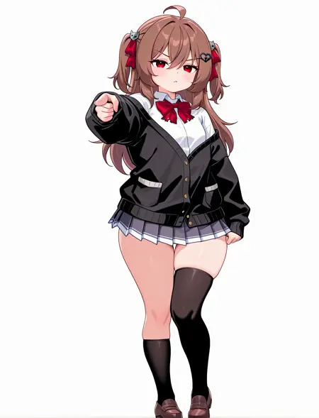 red bow, off shoulder black cardigan, black jacket, sleeves past wrists, white collared shirt, black pleated microskirt, asymmetrical black thighhigh, black single thighhigh, brown loafers,
