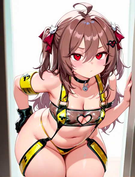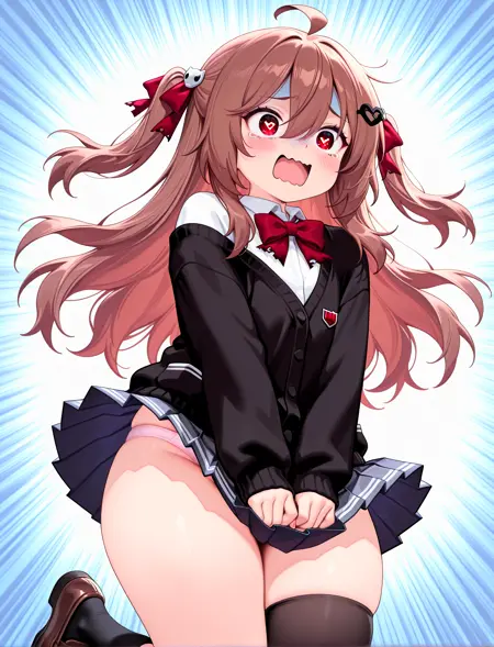 EvilV3, brown hair, long hair, two side up, red ribbons, hair between eyes, ahoge, red eyes, broken-heart hair ornament,