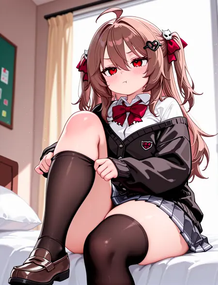 red bow, off shoulder black cardigan, black jacket, sleeves past wrists, white collared shirt, black pleated microskirt, asymmetrical black thighhigh, black single thighhigh, brown loafers,