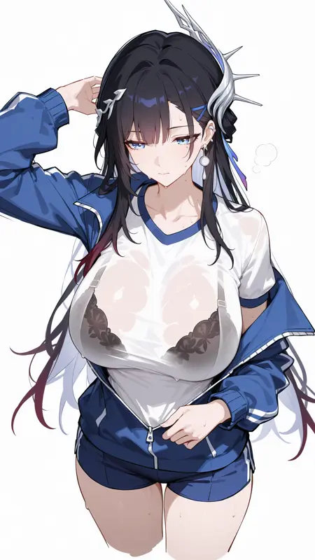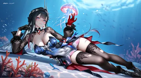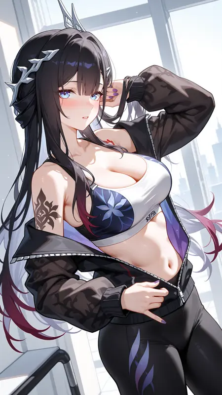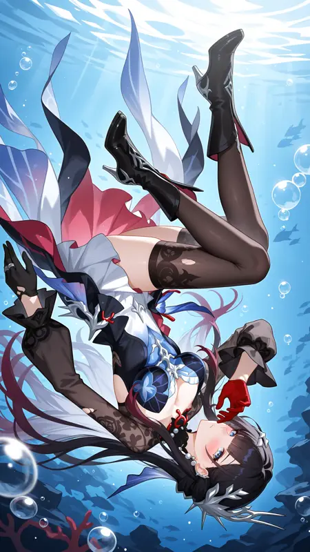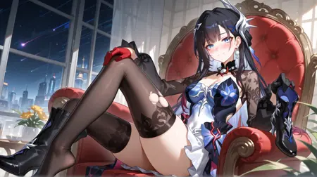 **全身:**hysilens \(honkai:star rail\),1girl,solo,long hair,black hair,multicolored hair,hair ornament,blue eyes,blush,