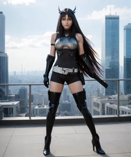 zuaexecutioner, 1girl, solo, long hair, black hair, red eyes, very long hair, hair between eyes, belt, boots, gloves, elbow gloves, high heels, armor, armored boots, armored gloves, shirt, thigh boots