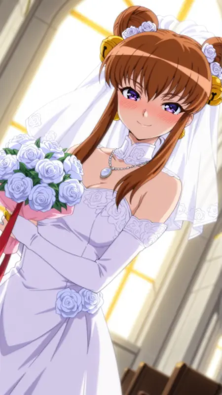 Appearance:necklace, brown hair, hair bun, double bun, sidelocks, purple eyes, hair bell, hair ornament,long hair,