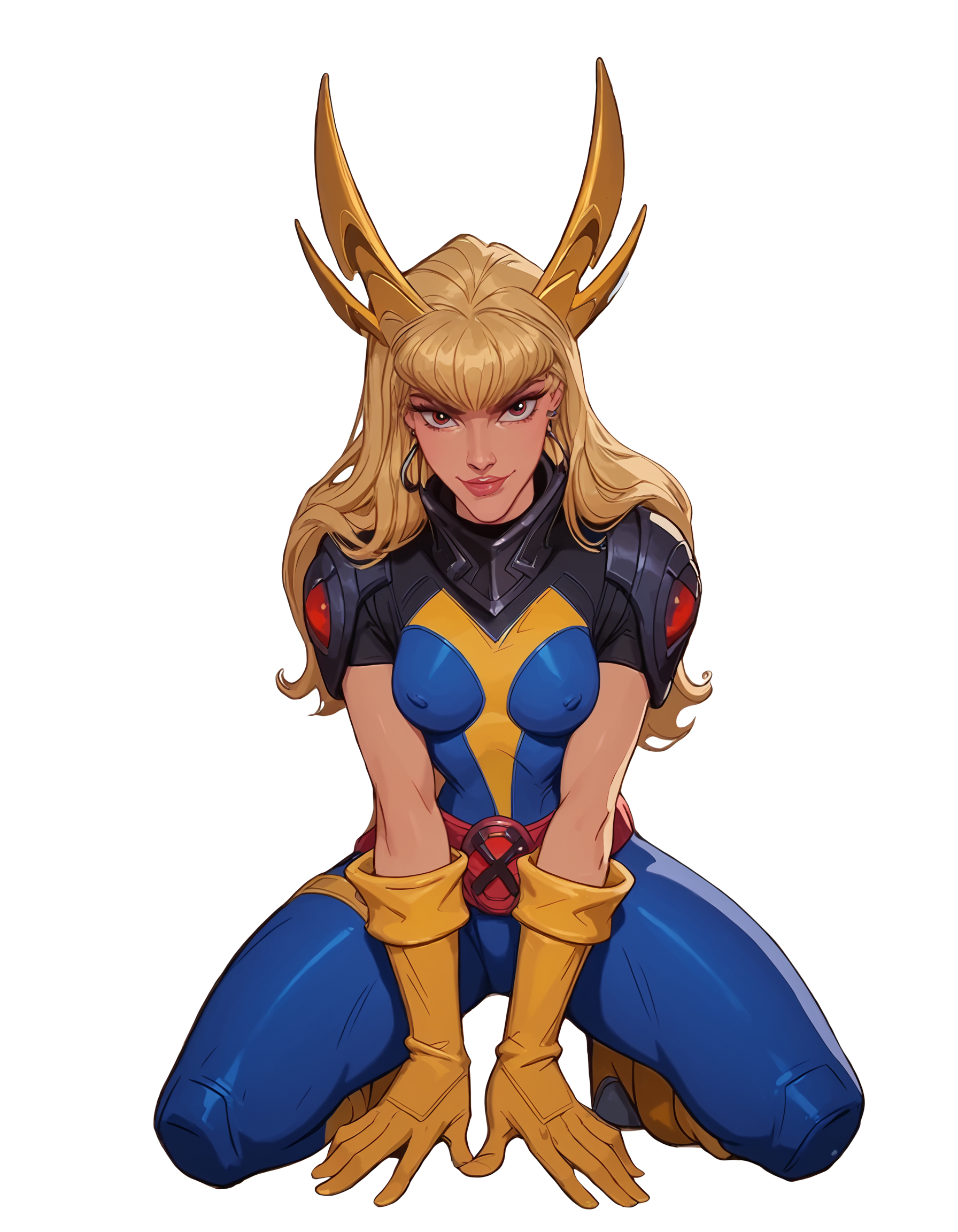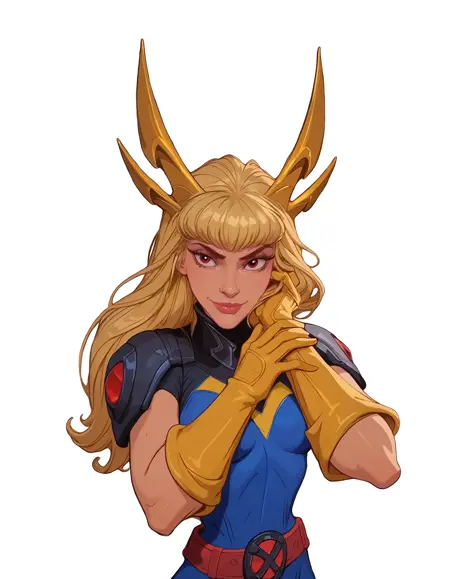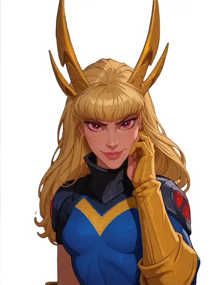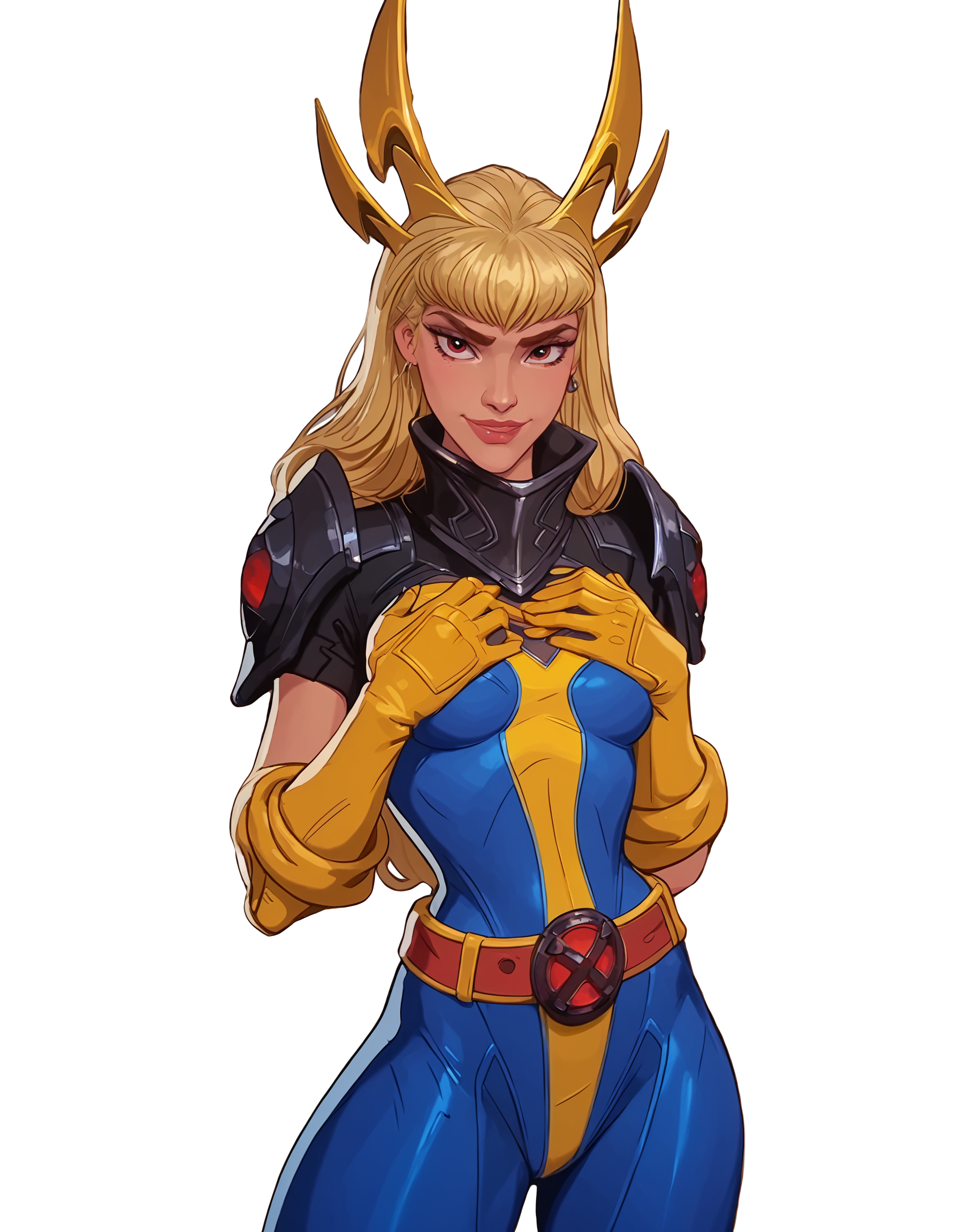 此皮肤源自《漫威对决》中的魔姬凤凰恶魔造型。可通过简单提示“凤凰恶魔造型”来生成该服装,额外配饰可根据需要通过正向和负向提示增强或移除。她的剑为固定元素,但可通过负向权重移除。