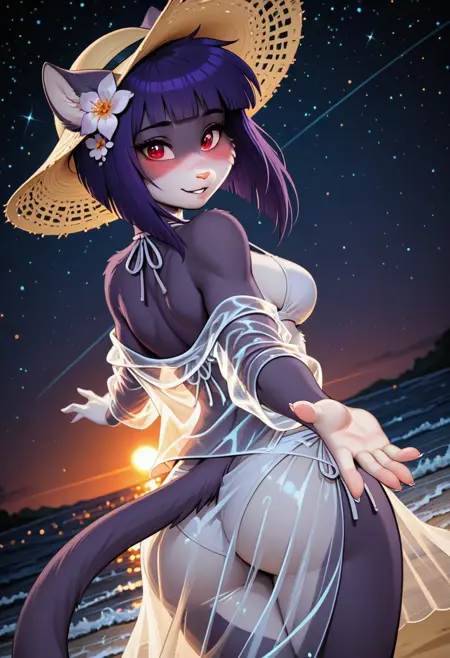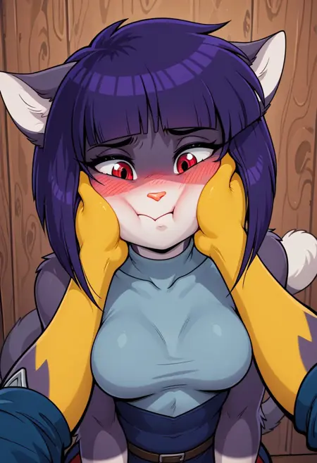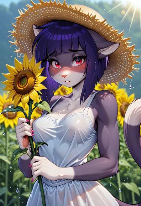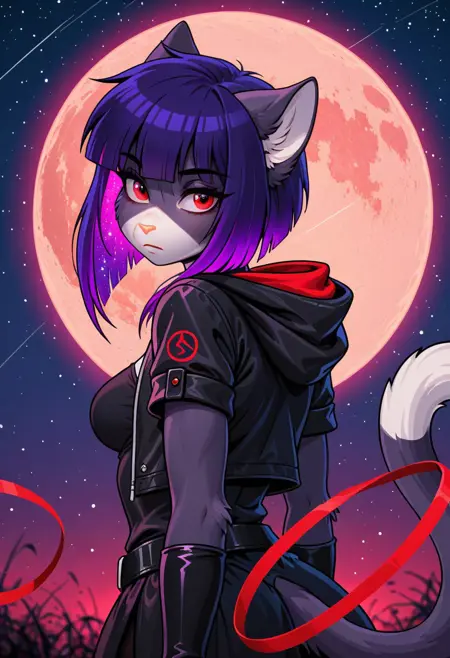S_Akane_SD,1girl, solo, animal ears, furry, furry female, purple hair, short hair, red eyes, tail, bangs, body fur, cat tail, medium breasts, blunt bangs, animal nose, cat girl,