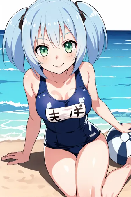dokuro, 1girl, smile, short hair, twintails, green eyes, blue hair, two side up, medium_breasts, halo,