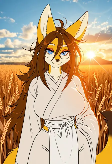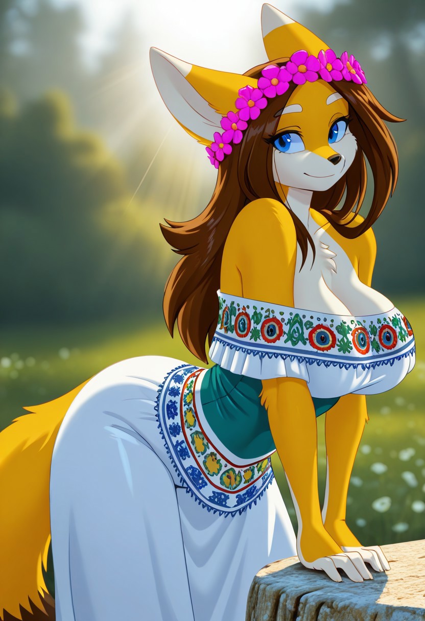 claire_o_sd, 1girl, solo, animal ears, furry, furry female, brown hair, large breasts, tail, blue eyes, animal nose, long hair, fox ears, body fur, yellow fur, fox girl, two-tone fur,