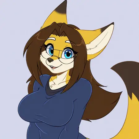 claire_o_sd, 1girl, solo, animal ears, furry, furry female, brown hair, large breasts, tail, blue eyes, animal nose, long hair, fox ears, body fur, yellow fur, fox girl, two-tone fur,