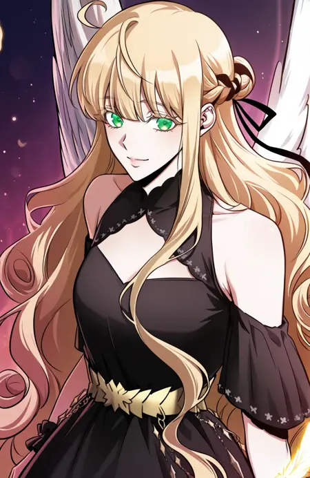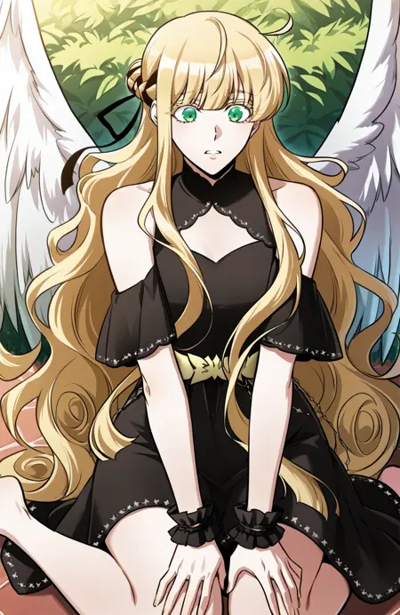 | トレーニングワード | Uriel, 1girl, solo, blonde hair, long hair, wavy hair, drill hair, hair curls, uneven bangs, see-through bangs, hair between eyes, long sidelocks, braided bun, half up, hair ribbon, black ribbon, green eyes, angel, white wings, feathers, small breasts,コピーしました! Uriel_outfit, black dress, high-low dress, asymmetrical hem, high collar, shoulder cutout, short sleeves, ruffled cuffs, cleavage cutout, waist belt, gold belt, star trim, diamond pattern, ankle ruffles, barefootコピーしました! |