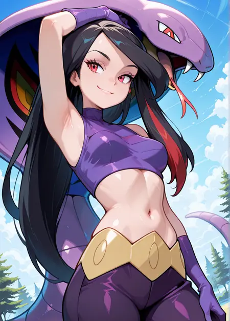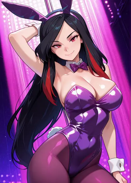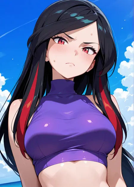 lucyxd, 1girl, long hair, black hair, multicolored hair, red hair, red eyes, two-tone hair, bangs,