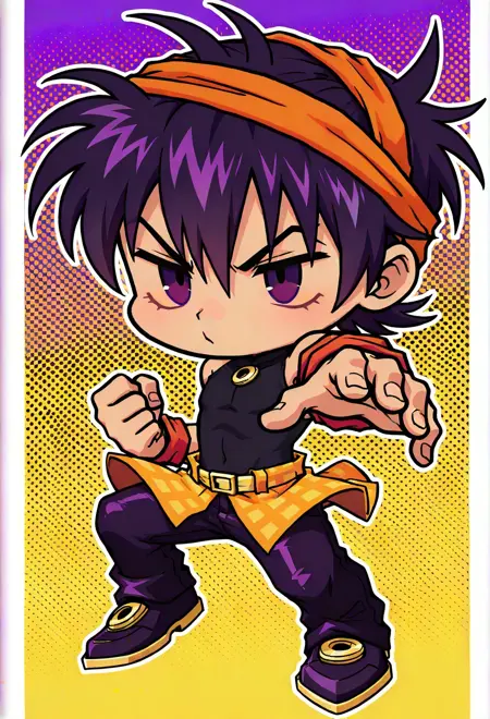 | トレーニングワード | NaranciaGhirgaFNF, 1boy, purple hair, purple eyes, no sclera, orange headband, dark purple crop top, messy dark purple hair with bangs, dark slim pants, orange wrist bands, orange short skirt, dark purple boots, narancia ghirga, short, chibiコピーしました! |