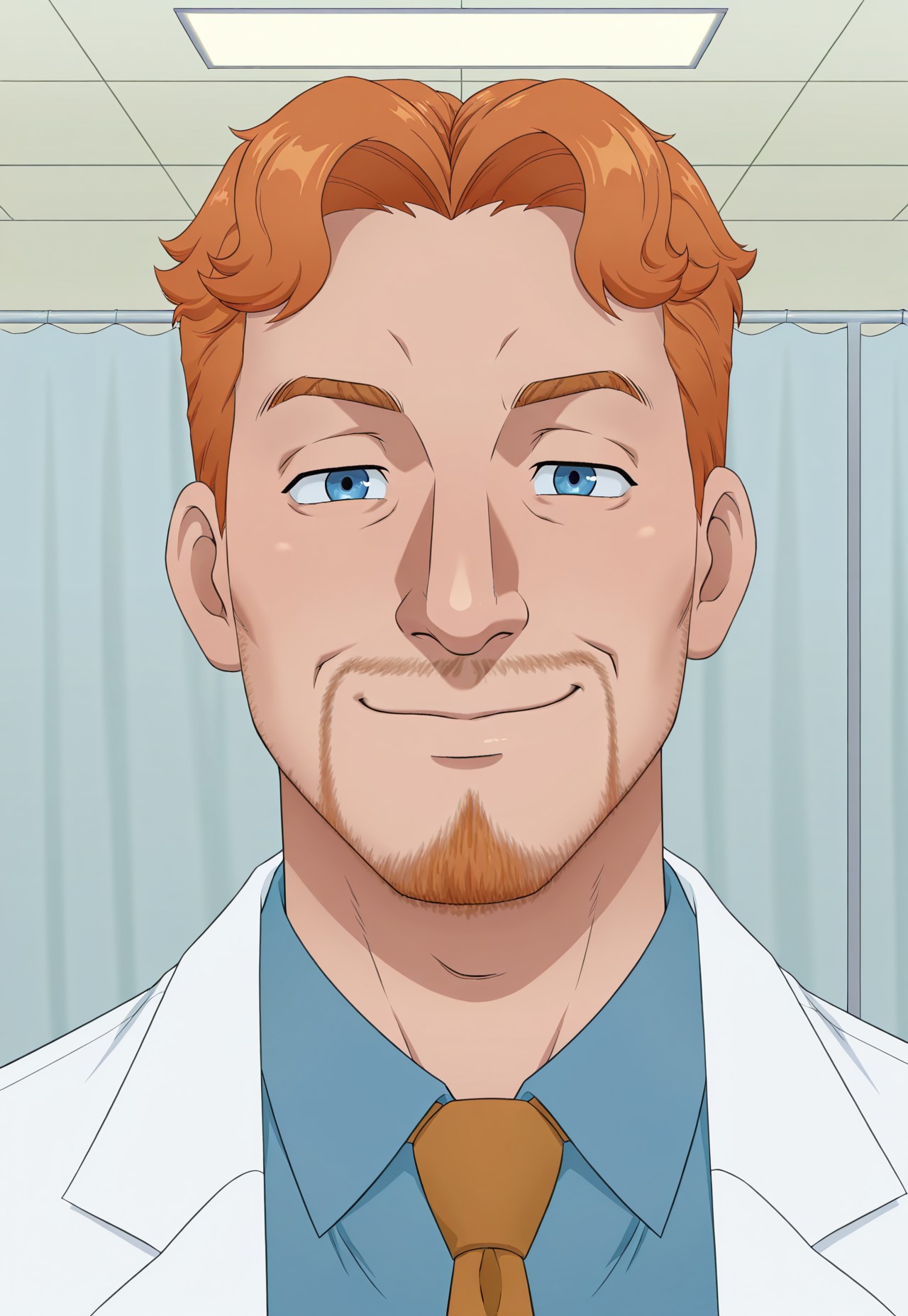 CoralCharles、オレンジ色の髪、顎ひげ、ラボコート、青シャツ、ネクタイ