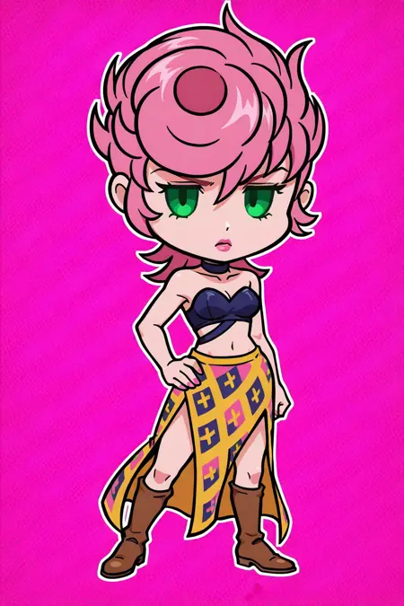 TrishFNF, trish una, 1girl, pink hair, green eyes, skirt, knee boots, short hair, choker, midriff, medium breasts, lipstick, pink lips, short, chibi, no sclera,