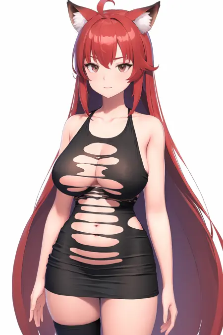 - 트리거 단어: 1girl, solo, breasts, navel, bare shoulders, black dress, areola slip, clothing cutout, no panties, short dress, torn clothes, sideboob