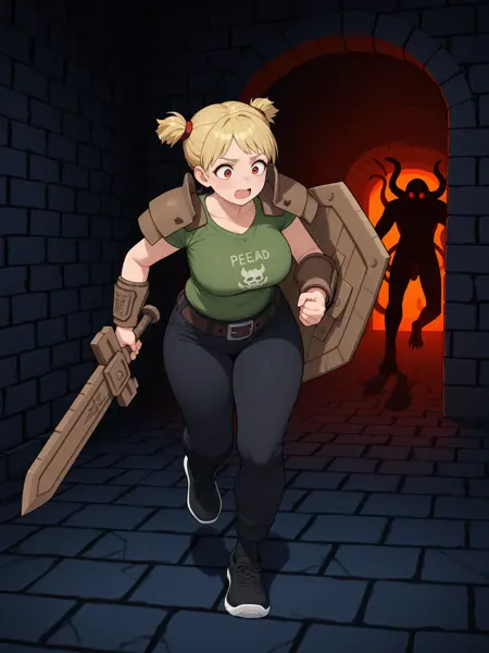 Triggers: hardstackgal, 1girl, plump, large breasts, blonde hair, short twintails, hair ornament, bangs, cardboard armor, cardboard shoulder armor, cardboard bracer, green shirt, belt, black pants, black socks, black footwear, holding sword, cardboard sword, holding shield, cardboard shield