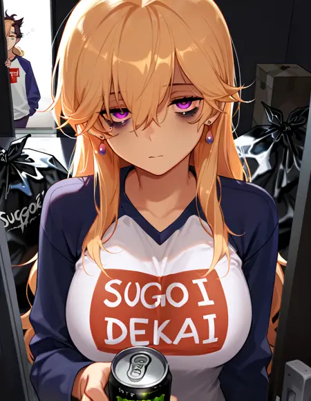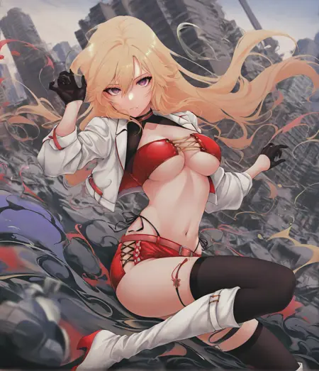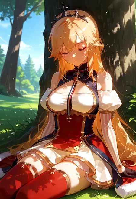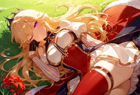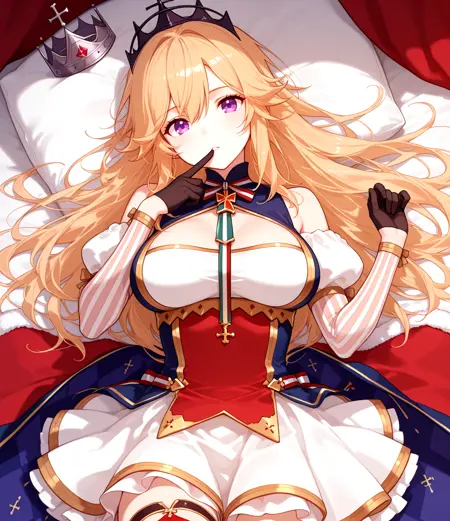 richdef, 금발, 긴 머리, 눈 사이의 머리카락, 보라색 눈, 큰 가슴, 왕관, 리본 목걸이, 흰색 계단식 드레스, 짧은 드레스, 높은 칼라, 옷 자르기, 흉부 아래, 어깨 노출, 금장식, 줄리엣 소매, 줄무늬 소매, 검은 반장갑, 다색 허리 망토, 빨간 허리 망토, 파란 허리 망토, 체크 무늬, 털 장식, 빨간 허벅지 스타킹, 허벅지 스트랩,
