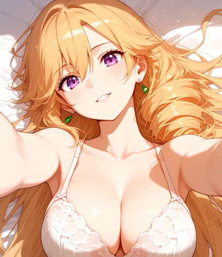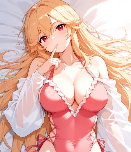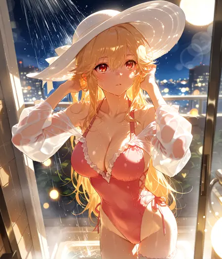 richelieuSwim, 금발, 눈 사이의 머리카락, 긴 머리, 붉은 눈, 큰 가슴, 흰색 일광호, 십자 끈 수영복, 프릴이 있는 원피스 수영복, 투명한 소매, 분리형 소매, 허벅지 스트랩, 가슴 사이의 틈,