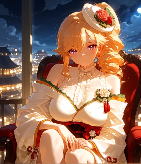 richeliEvgreen, 사이드 드릴, 금발, 긴 머리, 눈 사이의 머리카락, 보라색 눈, 큰 가슴, 귀걸이, 흰색 머리 장식, 기울어진 머리 장식, 모자 꽃, 흰장미, 빨강 장미, 김포 리본, 오비지메, 중앙 프릴, 긴 소매, 넓은 소매, 흰색 김포, 어깨 노출, 드릴 머리, 스윕 앞머리, 어깨 노출, 꼬리머리, 일본 복장,