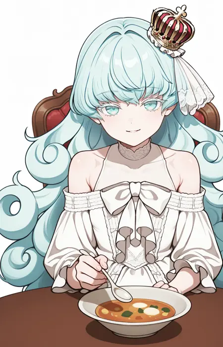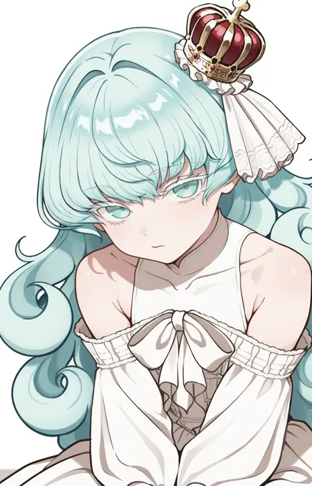 ミニクラウン、オフショルダードレス、フリル付きドレス、ロングスリーブ、白いリボン、ヘアオーナメント、白いドレス