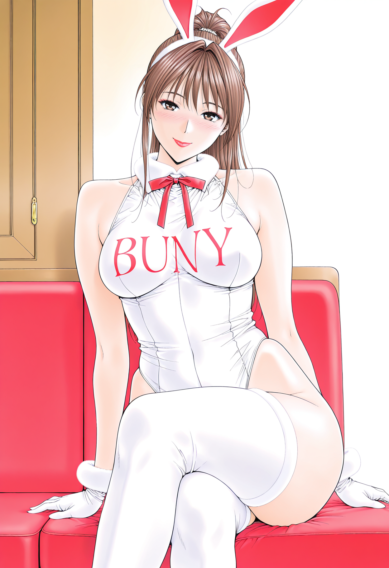 - playboy bunny, earrings, rabbit ears, red ribbon, white leotard, clothes writing, highleg, gloves, white thighhighs,
