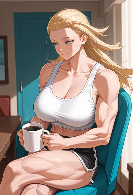 外观: muscular female, long hair, blonde hair, hair slicked back, blue eyes