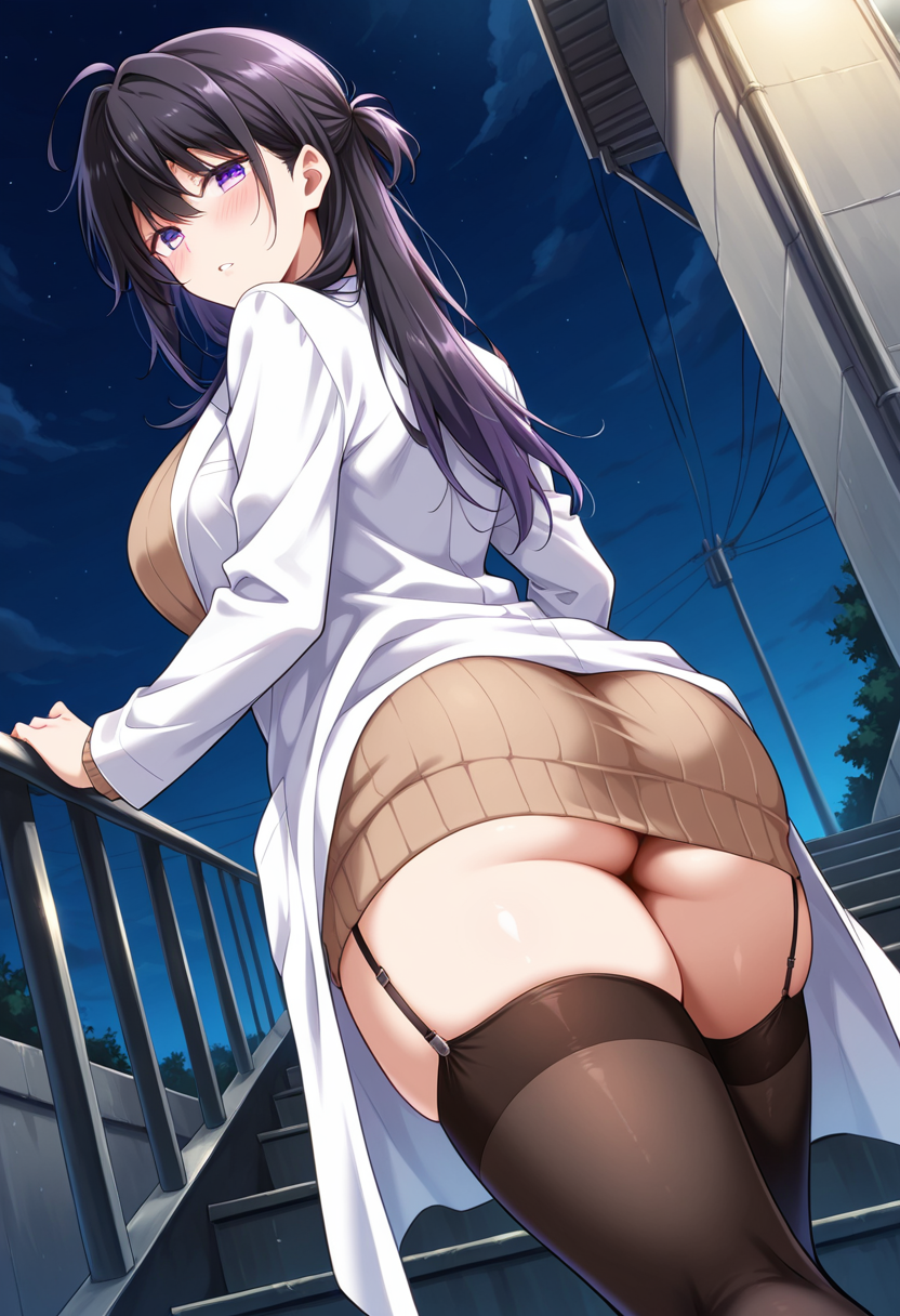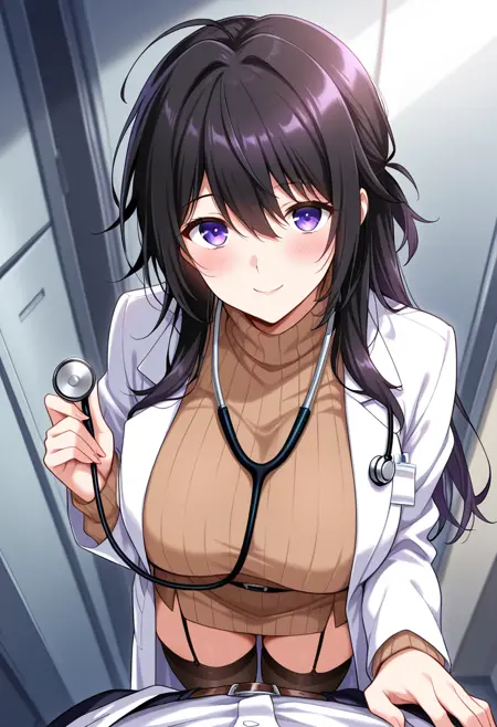Outfit 1 (Lab coat): KayamaAyumi, 1girl, long hair, black hair, ahoge, violet eyes, black thighhighs, pantyhose, lab coat, brown weater, garter straps, high heels