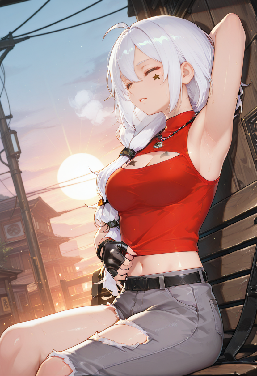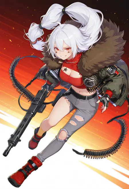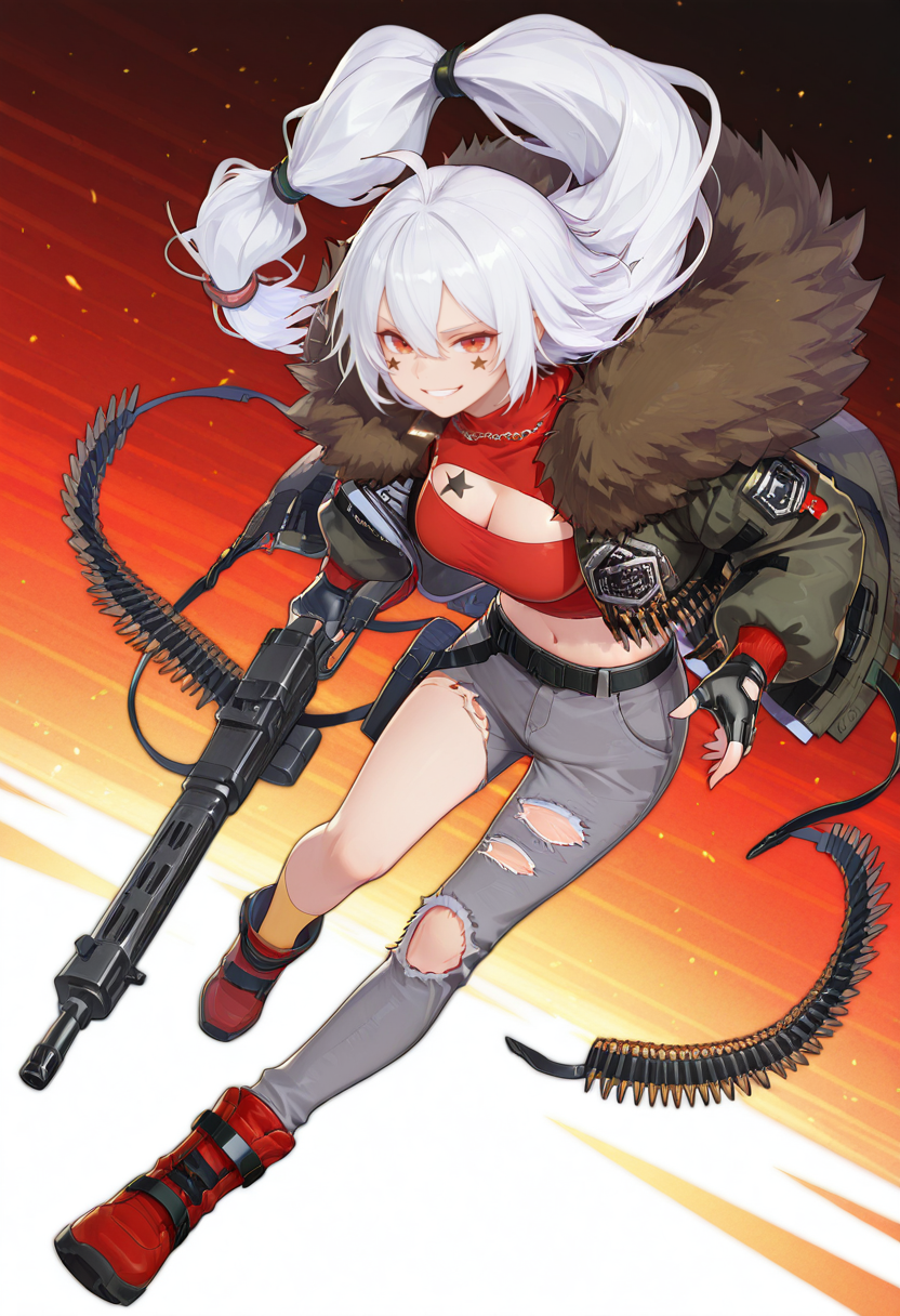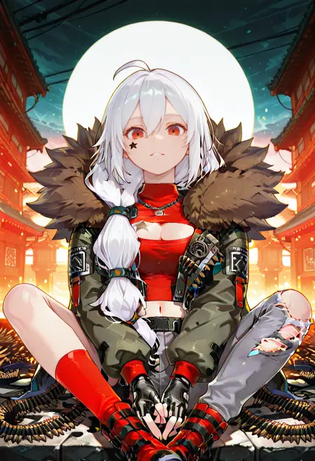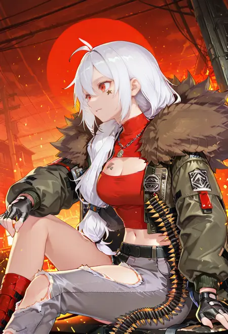 | 训练词汇 | white hair, long hair, multi-tied hair, hair between eyes, red eyes, facial mark, star (symbol), tattoo, necklace,已复制! fur trim, green jacket, open jacket, red shirt, cleavage cutout, crop top, midriff, navel, grey pants, torn pants, asymmetrical legwear, single pantleg, fingerless gloves, black gloves, red boots, ammunition belt,已复制! |
