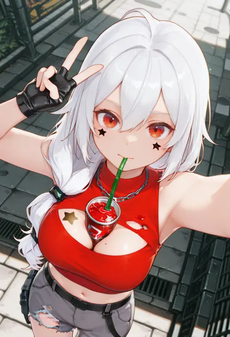| トレーニングワード | white hair, long hair, multi-tied hair, hair between eyes, red eyes, facial mark, star (symbol), tattoo, necklace,コピーしました! fur trim, green jacket, open jacket, red shirt, cleavage cutout, crop top, midriff, navel, grey pants, torn pants, asymmetrical legwear, single pantleg, fingerless gloves, black gloves, red boots, ammunition belt,コピーしました! |