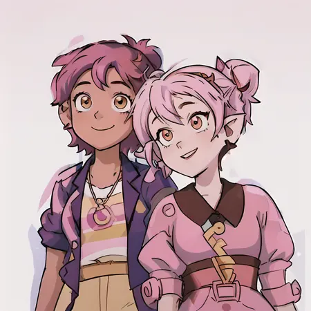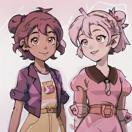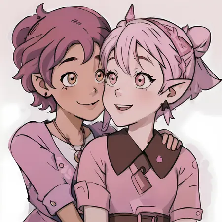 以下のキーワードを使用しました:二人の少女、(アミティはピンクの髪の結び目と(茶色の短髪:1)および尖った耳)、(ルツは短い茶色のカールした髪)、(ルツとアミティ:1.2)、(ルツ:1)、(アミティ:1)