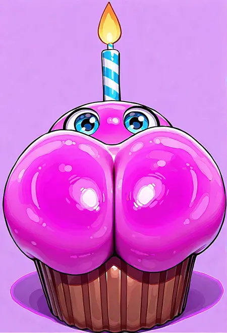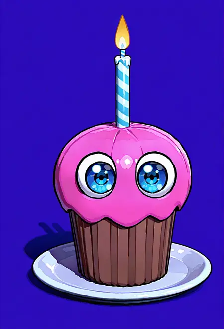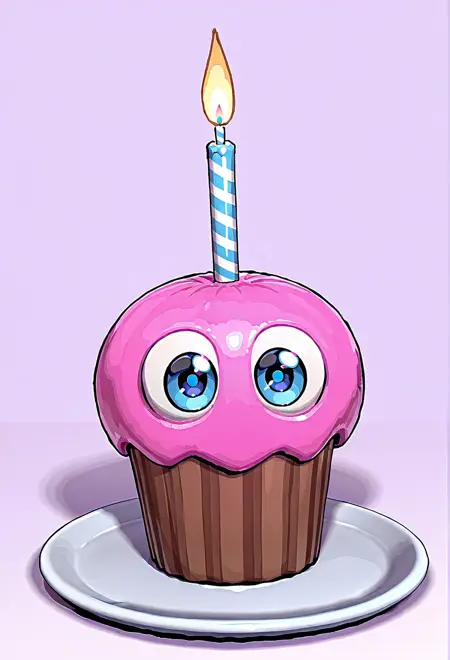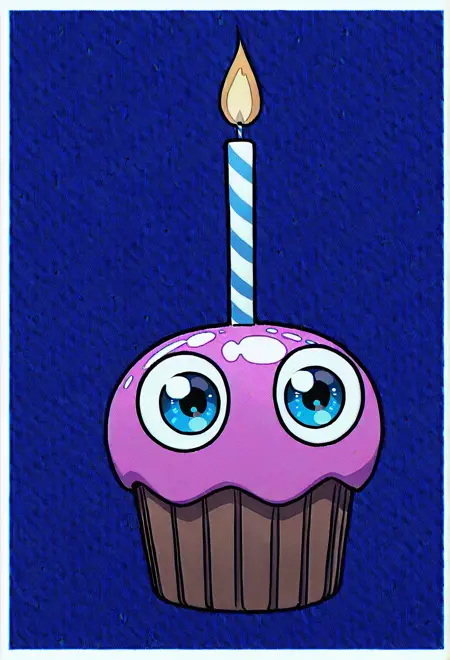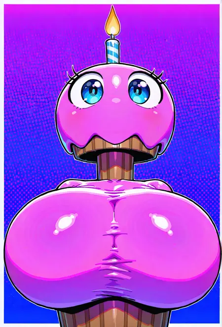 ToyCu0pckeFNAF2, 1boy, stylized cupcake, pink frosting top, large exaggerated blue eyes, organic skin, brown cupcake base, striped candle with a yellow flame atop of head, short, chibi, mouthless,