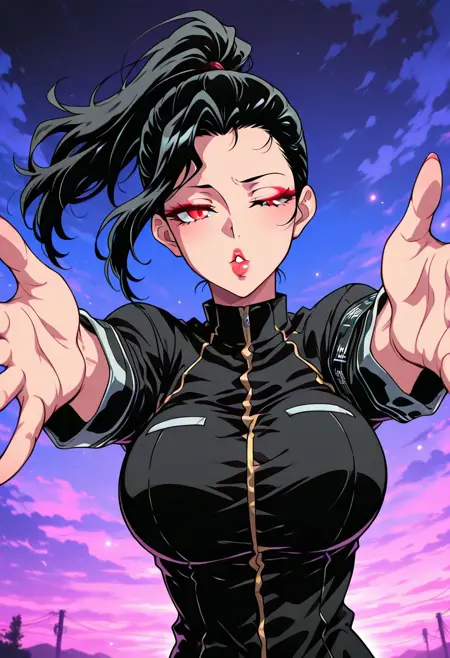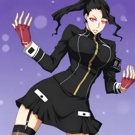 AdelheidSuzukiKHR, 1girl, solo, 곡선형 몸매, 검은색 머리카락, 높은 토끼 꼬리, 긴 머리카락, 빨간 눈, 두꺼운 입술, 유니폼, 검은 재킷, 거대한 가슴, 팔찌, 긴 소매, 빨간 손가락 없는 장갑, 짧은 검은 치마, 큰 엉덩이, 두꺼운 허벅지, 게터 스트랩, 팬티스타킹, 하이힐, 끈 달부츠, 십자 끈 신발, 절대 리ョ우이키